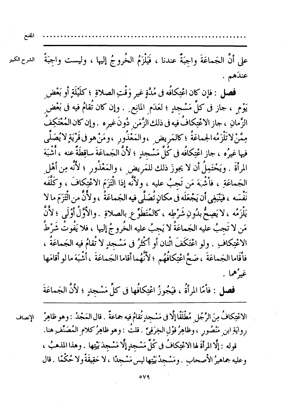 الاعْتِكافُ مِنَ الرَّجُلِ مُطْلَقًا إلَّا فى مَسْجِدٍ تُقامُ فيه جماعةٌ. قال المَجْدُ: وهو ظاهِرُ رِوايَةِ ابنِ مَنْصُورٍ، وظاهِرُ قولِ الخِرَقِىِّ. قلتُ: وهو ظاهِرُ كلامِ المُصَنِّفِ هنا.
