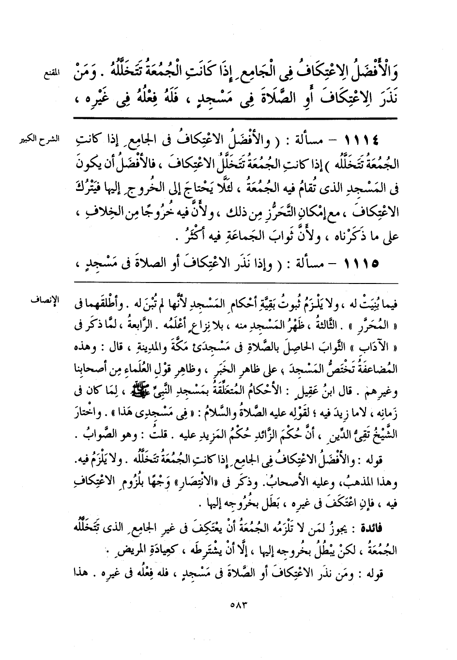 فيما بُنِيَتْ له، ولا يَلْزَمُ ثُبوتُ بَقِيَّةِ أحْكامِ المَسْجِدِ لأنَّها لم تُبْنَ له. وأطْلقَهما فى «المُحَرَّرِ». الثَّالثةُ، ظَهْرُ المَسْجِدِ منه، بلا نِزاعٍ أعْلَمُه. الرَّابعةُ، لما ذكَر فى «الآدَابِ» الثَّوابَ الحاصِلَ بالصَّلاةِ فى مَسْجِدَى مَكَّةَ والمدِينةِ، قال: وهذه المُضاعفَةُ تَخْتَصُّ المَسْجِدَ, على ظاهرِ الخَبَرِ، وظاهِرِ قوْلِ العُلَماءِ مِن أصحابِنا وغيرِهم. قال ابنُ عَقِيلٍ: الأحْكامُ المُتعلِّقَةُ بمَسْجِدِ النَّبِىِّ - صلى الله عليه وسلم -، لِمَا كان فى زَمانِه، لا ما زِيدَ فيه؛ لقَوْلِه عليه الصَّلاةُ والسَّلامُ: «فِى مَسْجِدِى هَذا». واخْتارَ الشَّيْخُ تَقِىُّ الدِّينِ، أن حُكْمَ الزَّائدِ حُكْمُ المَزِيدِ عليه. قلتُ: وهو الصَّوابُ.