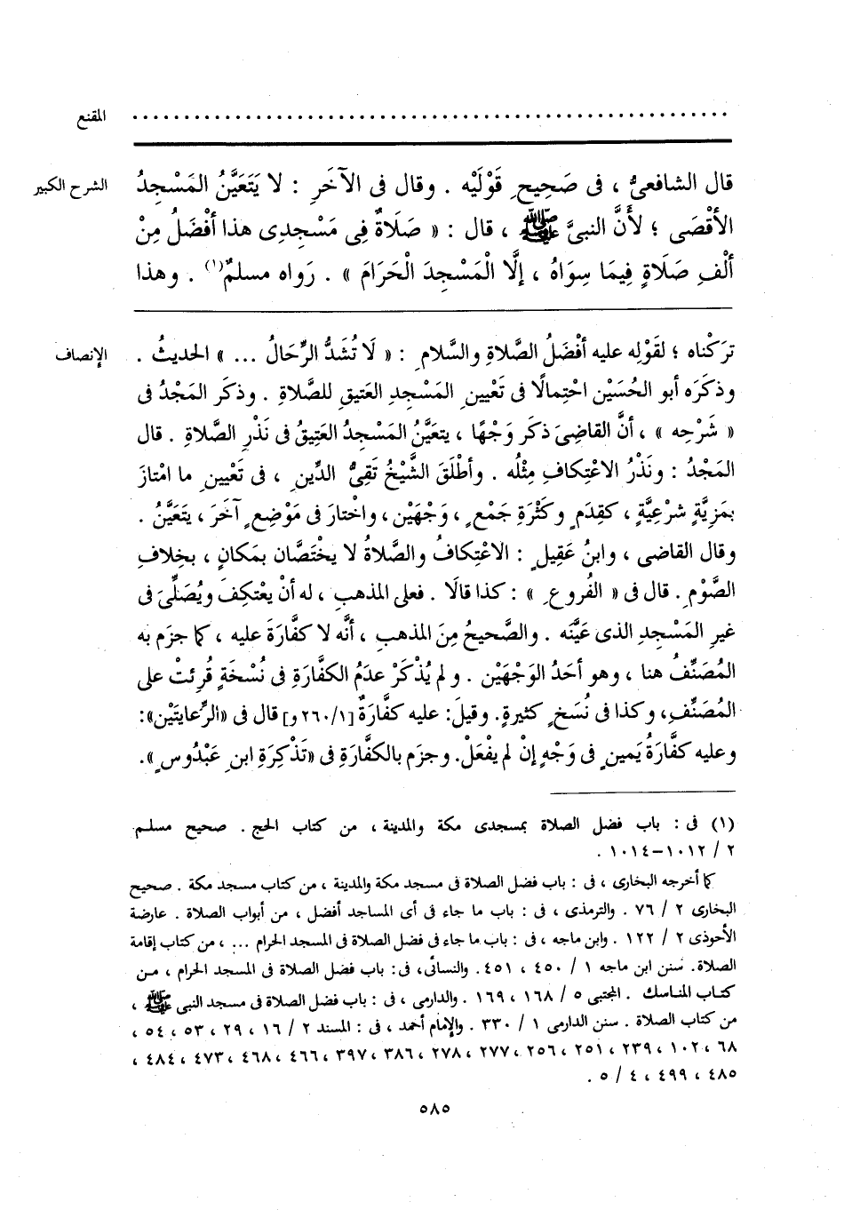 ترَكْناه؛ لقَوْلِه عليه أفْضَلُ الصَّلاةِ والسَّلامِ: «لَا تُشَدُّ الرِّحَالُ. . . .» الحديثُ. وذكرَه أبو الحُسَيْن احْتِمالًا فى تَعْيينِ المَسْجِدِ العَتيقِ للصَّلاةِ. وذكَر المَجْدُ فى «شَرْحِه»، أنَّ القاضِىَ ذكَر وَجْهًا، يتعَيَّنُ المَسْجِدُ العَتِيقُ فى نَذْرِ الصَّلاةِ. قال المَجْدُ: ونَذْرُ الاعْتِكافِ مِثْلُه. وأطْلَقَ الشَّيْخُ تَقِىُّ الدِّينِ، فى تَعْيينِ ما امْتازَ بمَزِيَّةٍ شرْعِيَّةٍ، كقِدَمٍ وكَثْرَةِ جَمْعٍ، وَجْهَيْن، واخْتارَ فى مَوْضِعٍ آخَرَ، يتَعَيَّنُ. وقال القاضى، وابنُ عَقِيلٍ: الاعْتِكافُ والصَّلاةُ لا يخْتَصَّان بمَكانٍ، بخِلافِ الصَّوْمِ. قال فى «الفُروعِ»: كذا قالَا. فعلى المذهبِ، له أنْ يعْتكِفَ ويُصلِّىَ فى غيرِ المَسْجِدِ الذى عَيَّنَه. والصَّحيحُ مِنَ المذهبِ، أنَّه لا كفَّارَةَ عليه، جزَم به المُصَنِّفُ هنا، وهو أحَدُ الوَجْهَيْن. ولم يُذْكَرْ عدَمُ الكفَّارَةِ فى نُسْخَةٍ قُرِئتْ على المُصَنِّفِ، وكذا فى نُسَخٍ كثيرةٍ. وقيلَ: عليه كفَّارَةٌ قال فى «الرِّعايتَيْن»: وعليه كفَّارَةُ يَمين فى وَجْهٍ إنْ لم يفْعَلْ. وجزَم بالكفَّارَةِ فى «تَذْكِرَةِ ابنِ عَبْدُوسٍ».