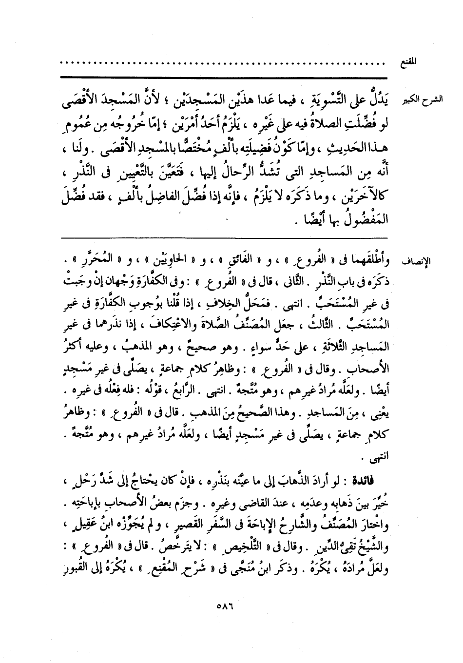 وأطْلقَهما فى «الفُروعِ»، و «الفَائقِ»، و «الحاوِيَيْن»، و «المُحَرَّرِ». ذكَرَه فى بابِ النَّذْرِ. الثَّانى، قال فى «الفُروعِ»: وفى الكفَّارَةِ وَجْهان إنْ وجَبتْ فى غيرِ المُسْتَحَبِّ. انتهى. فمَحَلُّ الخِلافِ، إذا قُلْنا بوُجوبِ الكفَّارَةِ فى غيرِ المُسْتَحبِّ. الثَّالثُ، جعَل المُصَنِّفُ الصَّلاةَ والاعْتِكافَ، إذا نذَرهما فى غيرِ المَساجِدِ الثَّلاَثَةِ، على حَدٍّ سواءٍ. وهو صحيحٌ، وهو المذهبُ، وعليه أكثرُ الأصحابِ. وقال فى «الفُروعِ»: وظاهِرُ كلام جماعةٍ، يصَلِّى فى غيرِ مَسْجِدٍ أيضًا. ولعَلَّه مُرادُ غيرِهم، وهو مُتَّجهٌ. انتهى. الرَّابعُ، قوْلُه: فله فِعْلُه فى غيرِه. يعْنِى، مِنَ المَساجدِ. وهذا الصَّحيحُ مِنَ المذهبِ. قال فى «الفُروعِ»: وظاهرُ كلامِ جماعةٍ، يصَلِّى فى غيرِ مَسْجِدٍ أيضًا، ولعَلَّه مُرادُ غيرِهم، وهو مُتَّجهٌ. انتهى.