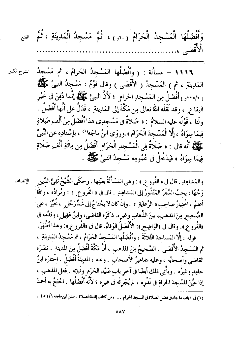 قوله: إلَّا المَساجِدَ الثَّلاَثةَ، وأفْضَلُها المَسْجدُ الحَرَامُ، ثم مَسْجِدُ المَدِينَةِ، ثم المَسْجِدُ الأَقْصَى. الصَّحيحُ مِنَ المذهبِ، أنَّ مَكةَ أفْضَلُ مِنَ المدينةِ. نصَرَه القاضى وأصحابُه، وعليه جماهيرُ الأصحابِ. وعنه، المدِينَةُ أفْضَلُ. اخْتارَه ابنُ حامِدٍ وغيرُه. ويأْتِى ذلك أيضًا فى آخرِ بابِ صَيْدِ الحَرَمِ ونَباتِه. فعلى المذهبِ، إذا عيَّنَ المسْجِدَ الحرامَ فى نَذْرِه، لم يُجْزِئْه فى غيرِه؛ لأنَّه أفْضَلُها. احْتَجَّ به أحمدُ