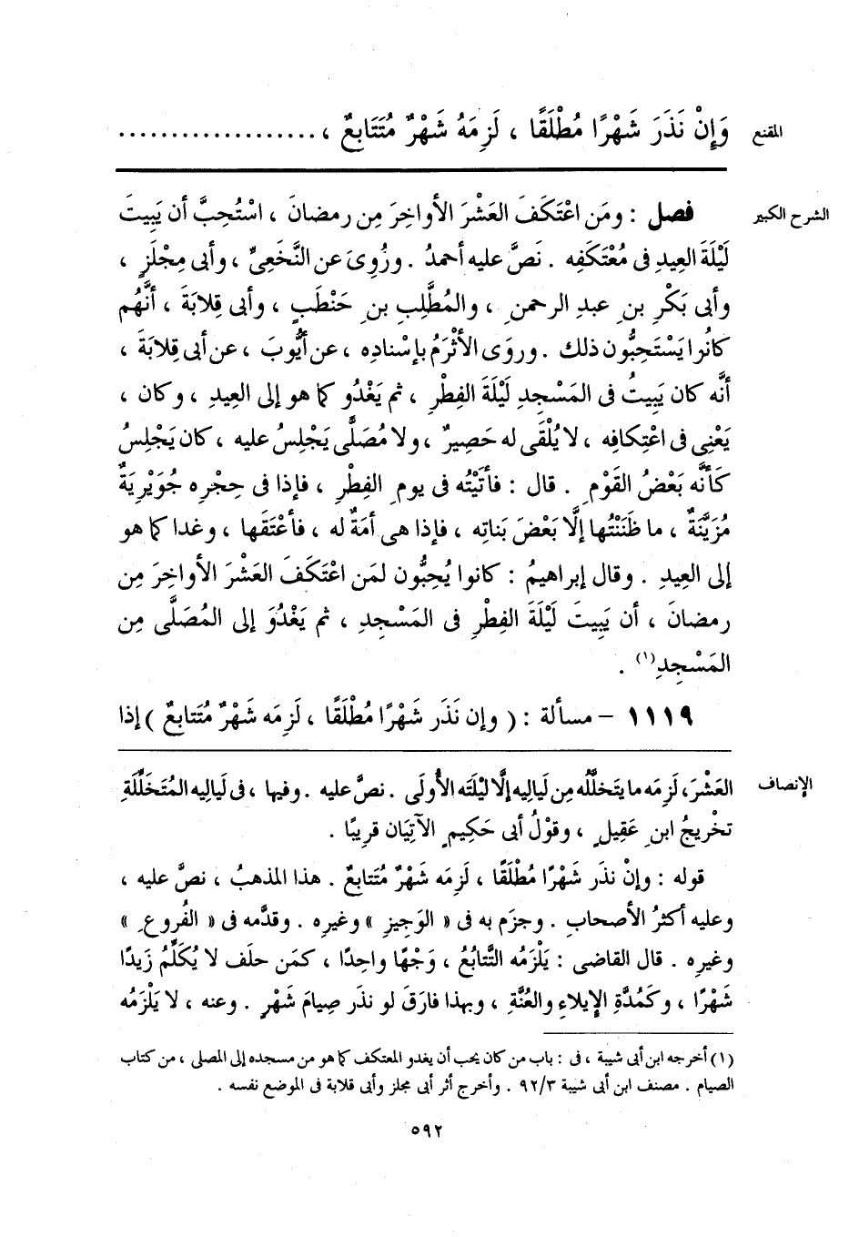 قوله: وإنْ نذَر شَهْرًا مُطْلَقًا، لَزِمَه شَهْرٌ مُتَتابِعٌ. هذا المذهبُ، نصَّ عليه، وعليه أكثرُ الأصحابِ. وجزَم به فى «الوَجيزِ» وغيرِه. وقدَّمه فى «الفُروعِ» وغيرِه. قال القاضى: يَلْزَمُه التَّتابُعُ، وَجْهًا واحِدًا، كمَن حلَف لا يُكَلَّمُ زَيدًا شَهْرًا، وكَمُدَّةِ الإيلاءِ والعُنَّةِ، وبهذا فارَقَ لو نذَر صِيامَ شَهْرٍ. وعنه، لا يَلْزَمُه
