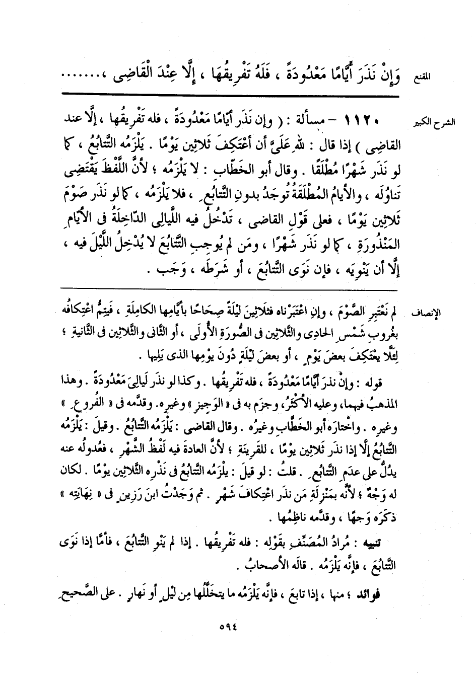 قوله: وإنْ نذرَ أيَّامًا مَعْدُودَةً، فله تَفْرِيقُها. وكذا لو نذَر لَيالِىَ مَعْدُودَةً. وهذا المذهبُ فيهما، وعليه الأكْثَرُ، وجزَم به فى «الوَجيزِ» وغيره. وقدَّمه فى «الفُروعِ» وغيرِه. واخْتارَه أبو الخَطَّابِ وغيرُه. وقال القاضى: يَلْزَمُه التَّتابُعُ. وقيلَ: يَلْزَمُه التَّتابُعُ إلَّا إذا نذَر ثَلاِثين يوْمًا، للقَرِينَةِ؛ لأنَّ العادةَ فيه لَفْظُ الشَّهْرِ، فعُدولُه عنه يدُلُّ على عدَمِ التَّتابُعِ. قلتُ: لو قيلَ: يلْزَمُه التَّتابُعُ فى نَذْرِه الثَّلاِثين يوْمًا. لكان له وَجْهٌ؛ لأنَّه بمَنْزِلَةِ مَن نذَر اعْتِكافَ شَهْرٍ. ثم وَجَدْتُ ابنَ رَزِينٍ فى «نِهَايته» ذكَرَه وَجهًا، وقدَّمه ناظِمُها.