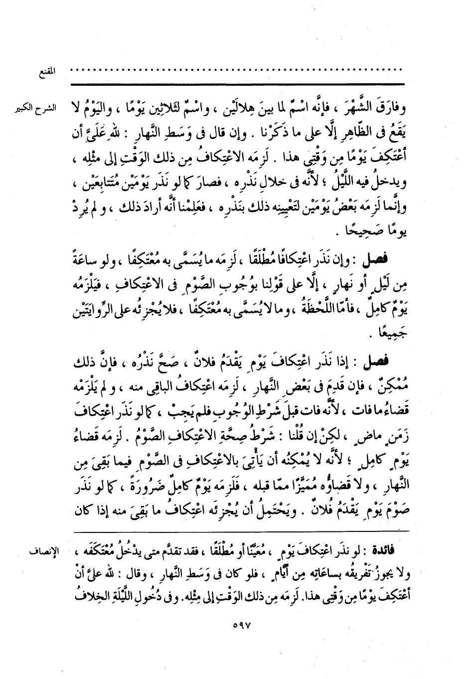 فائدة: لو نذَر اعْتِكافَ يَوْمٍ، مُعَيَّنًا أو مُطْلَقًا، فقد تقدَّم متى يدْخُلُ مُعْتَكَفَه، ولا يجوزُ تَفْريفُه بساعَاتِه مِن أيّامٍ، فلو كان فى وَسَطِ النَّهارِ، وقال: لله علىَّ أنْ أعْتَكِفَ يوْمًا مِن وَقتى هذا. لَزِمَه مِن ذلك الوَقتِ إلى مِثْلِه. وفى دُخُولِ اللَّيْلَةِ الخِلافُ