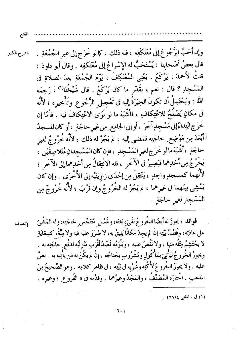 فوائد؛ يجوزُ له أيضًا الخُروجُ لقَىْءٍ بَغتَه، وغَسْلِ مُتَنَجِّسٍ لحاجَتِه، وله المَشْىُ على عادَتِه، وقَصْدُ بَيْتِه إِن لم يجِدْ مَكانًا يليقُ به، لا ضَرَرَ عليه فيه ولا مِنَّةً، كسِقايَةٍ لا يحْتَشِمُ مِثْلُه منها، ولا نَقْصَ عليه، ويَلْزَمُه قَصْدُ أقْرَبِ مَنْزِلَيْه لدَفْعِ حاجَتِه به. ويجوزُ الخُروجُ ليَأْتِىَ بمَأْكُولٍ ومَشْرُوبٍ يحْتاجُه، إنْ لم يكُنْ له مَن يأْتِيه به. نصَّ عليه. ولا يجوزُ الخُروجُ لأَكْلِه وشُرْبِه فى بَيْتِه، فى ظاهرِ كلامِه. وهو الصَّحيحُ مِنَ المذهبِ. اخْتارَه المُصَنِّفُ، والمَجْدُ وغيرُهما. وقدَّمه فى «الفُروعِ» وغيرِه.