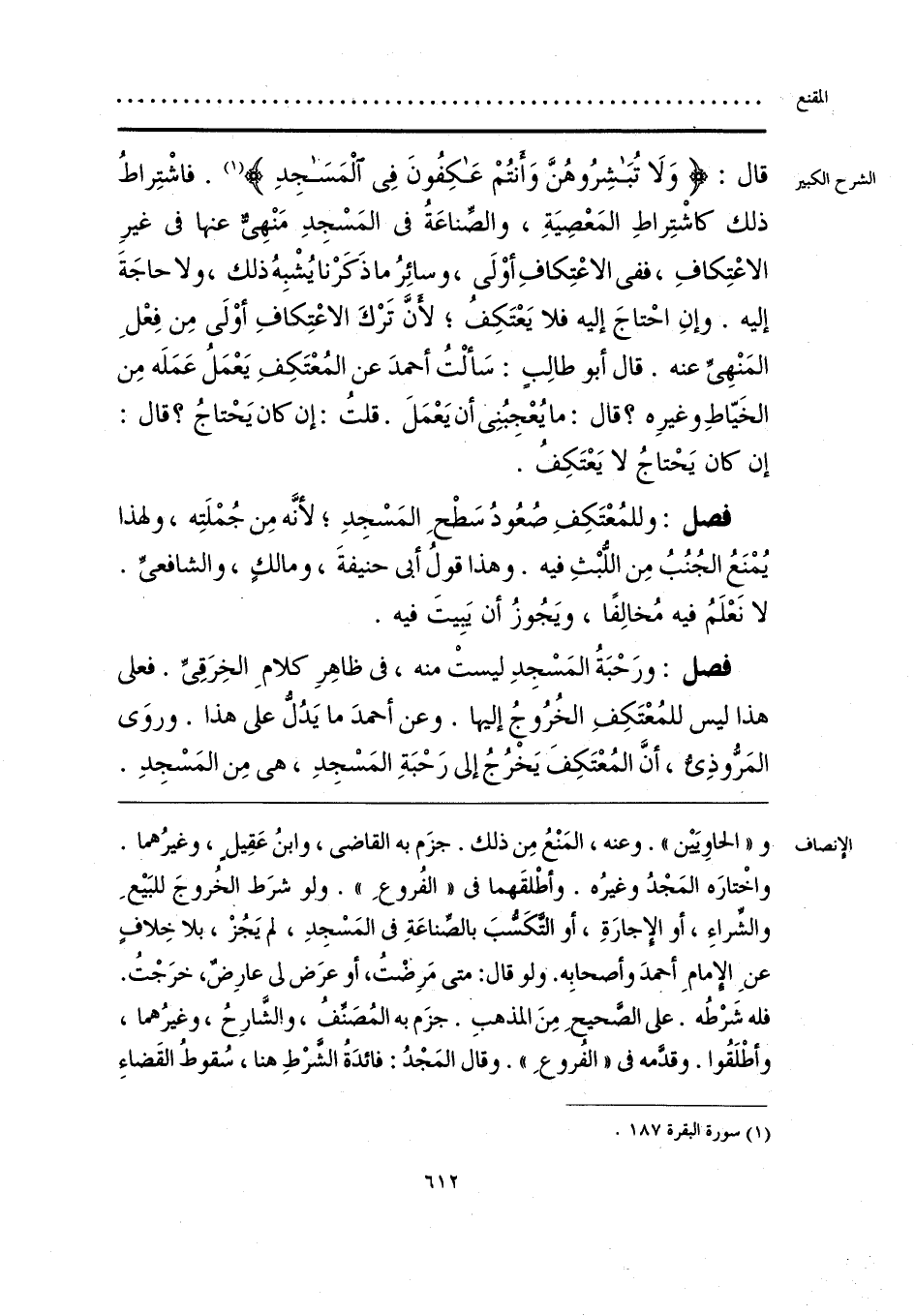 و «الحاوِيَيْن». وعنه، المَنْعُ مِن ذلك. جزَم به القاضى، وابنُ عَقِيلٍ، وغيرُهما. واخْتارَه المَجْدُ وغيرُه. وأطْلقَهما فى «الفُروعِ». ولو شرَط الخروجَ للبَيْعِ والشِّراءِ، أو الإِجارَةِ، أو التَّكَسُّبَ بالصِّناعَةِ فى المَسْجِدِ، لم يَجُزْ، بلا خِلافٍ عنِ الإِمامِ أحمدَ وأصحابِه. ولو قال: متى مَرِضْتُ، أو عرَض لى عارِضٌ، خرَجْتُ. فله شَرْطُه. على الصَّحيحِ مِنَ المذهبِ. جزَم به المُصَنِّفُ، والشَّارِحُ، وغيرُهما، وأطْلَقُوا. وقدَّمه فى «الفُروعِ». وقال المَجْدُ: فائدَةُ الشَّرْطِ هنا، سُقوطُ القَضاءِ
