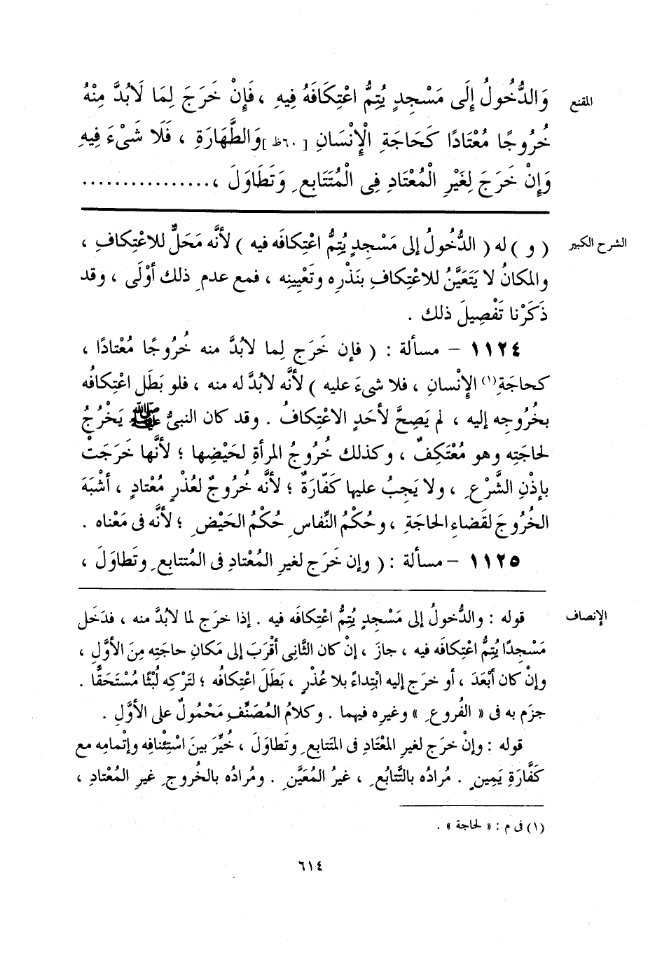 وَالدُّخُولُ إِلَى مَسْجِدٍ يُتِمُّ اعْتِكَافَهُ فِيهِ، فَإِنْ خَرَجَ لِمَا لَا بُدَّ مِنْهُ خُرُوجًا مُعْتَادًا كَحَاجَةِ الإِنْسَانِ [60 ظ] وَالطَّهَارَةِ، فَلَا شَىْءَ فِيهِ وَإِنْ خَرَجَ لِغَيْرِ الْمُعْتَادِ فِى الْمُتَتَابِعِ وَتَطَاوَلَ،