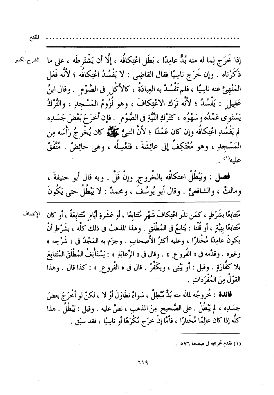 مُتَتابِعًا بشَرْطٍ، كمَن نذَر اعْتِكافَ شَهْرٍ مُتَتابِعًا، أو عَشَرةِ أيَّامٍ مُتَتابِعَةً، أو كان مُتَتابعًا بِنيَّةٍ، أو قُلْنا: يُتابِعُ فى المُطْلَقِ. وهذا المذهبُ فى ذلك كلِّه، بشَرْطِ أنْ يكونَ عامِدًا مُخْتارًا، وعليه أكثرُ الأصحابِ. وجزَم به المَجْدُ فى «شَرْحِه» وغيره. وقدَّمه فى «الفُروعِ». وقال فى «الرِّعايَةِ»: يَسْتَأْنِفُ المُطْلَقَ المُتَتابع بلا كفّارَةٍ. وقيل: أو يَبْنِى، ويكَفِّرُ. قال فى «الفُروعِ»: كذا قال. وهذا القوْلُ مِنَ المُفْرَداتِ.