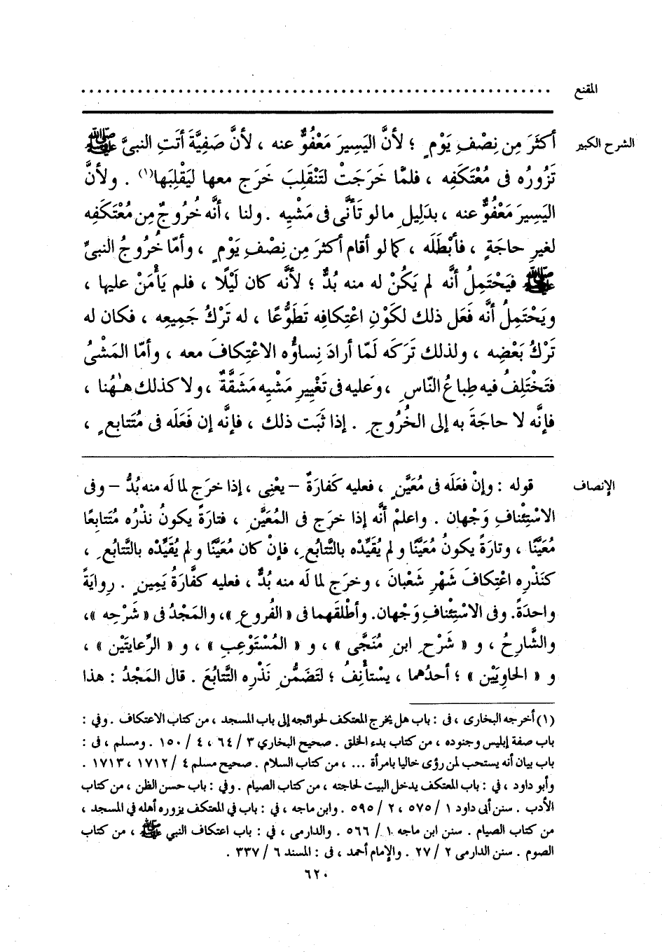قوله: وإنْ فعَلَه فى مُعَيَّنٍ، فعليه كَفّارَةٌ - يعْنِى، إذا خرَج لما لَه منه بُدُّ - وفى الاسْتِئْنافِ وَجْهان. واعلمْ أنَّه إذا خرج فى المُعَيَّنِ، فتارَةً يكونُ نذْرُه مُتَتابِعًا مُعَيَّنًا، وتارَةً يكونُ مُعَيَّنًا ولم يُقَيِّدْه بالتَّتابُعِ، فإنْ كان مُعَيَّنًا ولم يُقَيِّدْه بالتَّتابُعِ، كنَذْرِه اعْتِكافَ شَهْرِ شَعْبانَ، وخرَج لما لَه منه بُدٌّ، فعليه كفّارَةُ يَمِين. رِوايَةً واحدَةً. وفى الاسْتِئْنافِ وَجْهان. وأطْلقَهما فى «الفُروعِ»، والمَجْدُ فى «شَرْحِه»، والشَّارِحُ، و «شَرْحِ ابنِ مُنَجَّى»، و «المُسْتَوْعِبِ»، و «الرِّعايتَيْن»، و «الحاوِيَيْن»؛ أحدُهما، يسْتأْنِفُ؛ لتَضَمُّنِ نَذرِه التَّتابُعَ. قال المَجْدُ: هذا