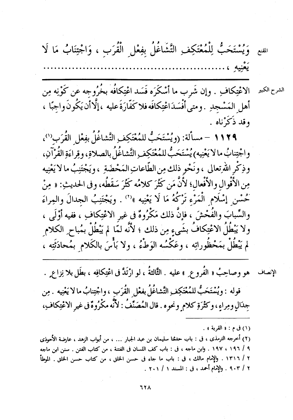 قوله: ويُسْتَحَبُّ للمُعْتَكِفِ التَّشاغُلُ بفعْلِ القُرَب، واجْتِنابُ ما لا يَعْنِيه. مِن جِدَالٍ ومِراءٍ، وكثْرَةِ كلامٍ ونحوِه. قال المُصَنِّفُ: لأنَّه مكْرُوهٌ فى غيرِ الاعْتِكافِ،