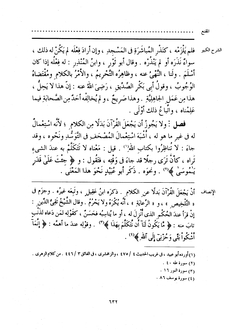 أنْ يَجْعَلَ القُرآنَ بَدلًا عنِ الكلام. ذكرَه ابنُ عَقِيلٍ، وتَبِعَه غيرُه. وجزَم فى «التَّلْخِيصِ»، و «الرَّعايَةِ»، أَنَّه يُكْرَهُ ولا يَحْرُمُ. وقال الشَّيْخُ تَقِى الدِّينِ: إنْ قرَأ عندَ الحُكْمِ الذى أُنزِلَ له، أو ما يُناسِبُه فحَسَنٌ، كقَوْلِه لمَن دَعاه لذَنْبٍ تابَ منه: {مَا يَكُونُ لَنَا أَنْ نَتَكَلَّمَ بِهَذَا} (¬1). وقوْلِه عندَ ما أهمَّه: {إِنَّمَا أَشْكُو بَثِّي وَحُزْنِي إِلَى اللَّهِ} (¬2).