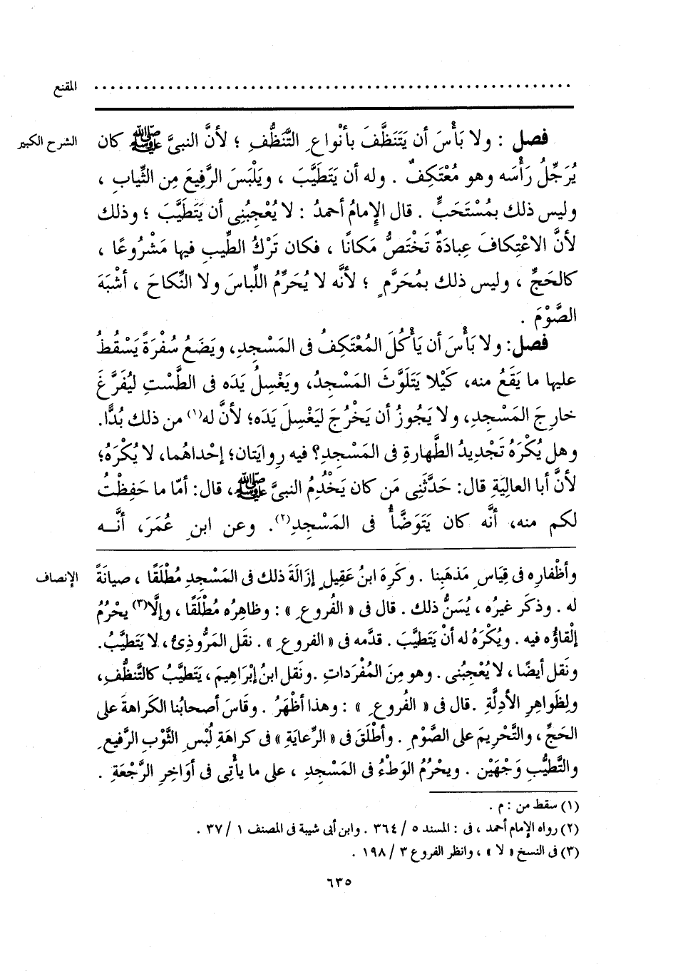 وأظْفارِه فى قِيَاسِ مَذهَبِنا. وكَرِهَ ابنُ عَقِيلٍ إزَالَةَ ذلك فى المَسْجِدِ مُطْلَقًا، صيانَةً له. وذكَر غيرُه، يُسَنُّ ذلك. قال فى «الفُروعِ»: وظاهِرُه مُطْلَقًا، وإلَّا (¬1) يحْرُمُ إلْقاؤه فيه. ويُكْرَهُ له أنْ يَتَطيَّبَ. قدَّمه فى «الفروعِ». نقَل المَرُّوذِىُّ، لا يَتَطيَّبُ. ونَقل أيضًا، لا يُعْجِبُنى. وهو مِنَ المُفْرَداتِ. ونَقل ابنُ إبْرَاهِيمَ، يَتَطيَّبُ كالتَّنظُّفِ، ولِظَواهِرِ الأدِلَّةِ. قال فى «الفُروعِ»: وهذا أظْهَرُ. وقَاسَ أصحابُنا الكَراهةَ على الحَجِّ، والتَّحْرِيمَ على الصَّوْمِ. وأطْلَقَ فى «الرِّعايَةِ» فى كراهَةِ لُبْسِ الثَّوْبِ الرَّفيعِ والتَّطيُّبِ وَجْهَيْن. ويحْرُمُ الوَطْءُ فى المَسْجِدِ، على ما يأْتِى فى أوَاخِرِ الرَّجْعَةِ.
