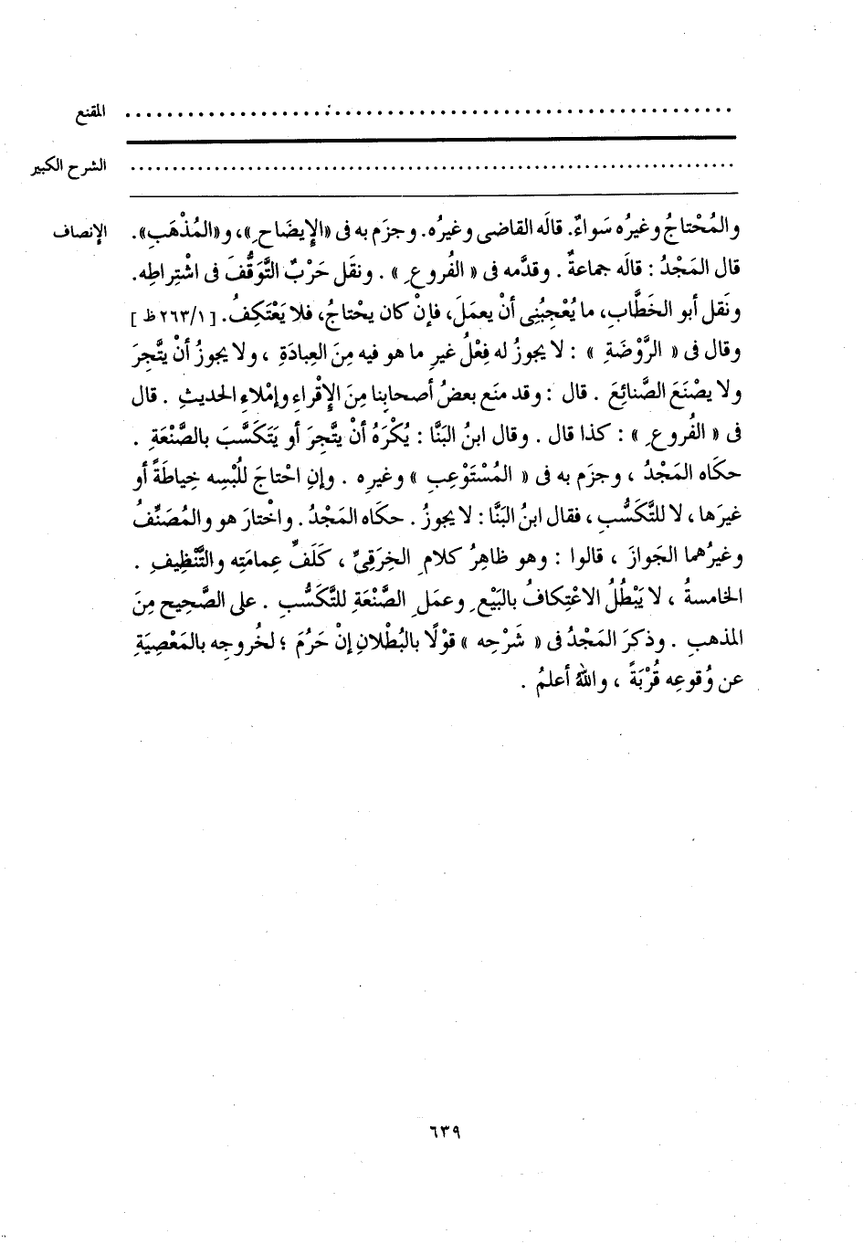 والمُحْتاجُ وغيرُه سَواءٌ. قالَه القاضي وغيرُه. وجزَم به في «الإيضَاحِ»، و «المُذْهَبِ». قال المَجْدُ: قالَه جماعةٌ. وقدَّمه في «الفُروعِ». ونقَل حَرْبٌ التَّوَقُّفَ في اشْتِراطِه. ونَقل أبو الخَطَّابِ، ما يُعْجِبُنِى أنْ يعمَلَ، فإنْ كان يحْتاجُ، فلا يَعْتَكِفُ. وقال في «الرَّوْضَةِ»: لا يجوزُ له فِعْلُ غيرِ ما هو فيه مِنَ العِبادَةِ، ولا يجوزُ أن يتَّجِرَ ولا يصْنَعَ الصَّنائِعَ. قال: وقد منَع بعضُ أصحابِنا مِنَ الإِقْراءِ وإمْلاءِ الحديثِ. قال في «الفُروعِ»: كذا قال. وقال ابنُ البَنَّا: يُكْرَهُ أن يتَّجِرَ أو يَتَكَسَّبَ بالصَّنْعَةِ. حكَاه المَجْدُ، وجزَم به في «المُسْتَوْعِبِ» وغيرِه. وإنِ احْتاجَ للُبْسِه خِياطَةً أو غيرَها، لا للتَّكَسُّبِ، فقال ابنُ البَنَّا: لا يجوزُ. حكَاه المَجْدُ. واخْتارَ هو والمُصَنِّفُ وغيرُهما الجَوازَ، قالوا: وهو ظاهِرُ كلامِ الخِرَقِىِّ، كَلَفِّ عِمامَتِه والتَّنْظِيفِ. الخامسةُ، لا يَبْطُلُ الاعْتِكافُ بالبَيْعِ وعمَلِ الصَّنْعَةِ للتَّكَسُّبِ. على الصَّحِيح مِنَ المذهبِ. وذكرَ المَجْدُ في «شَرْحِه» قوْلًا بالبُطْلانِ إنْ حَرُمَ؛ لخُروجِه بالمَعْصِيَةِ عن وُقوعِه قُرْبَةً، واللهُ أعلمُ.