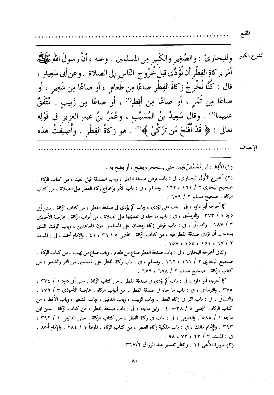وللبخارىِّ: والصَّغِيرِ والكَبِيرِ مِن المسلمين. وعنه، أنَّ رسولَ اللَّهِ -صلى اللَّه عليه وسلم- أمَر بزكاةِ الفِطْرِ أن تُؤَدَّى قبلَ خُرُوجِ النّاسِ إلى الصَّلاةِ. وعن أبى سَعِيدٍ، قال: كُنَّا نُخْرِجُ زكاةَ الفِطْرِ صاعًا مِن طَعام، أو صاعًا مِن شَعِير، أو صاعًا مِن تَمْرٍ، أو صاعًا مِن أقطٍ (¬1)، أو صاعًا مِن زَبِيب. مُتَّفَقٌ عليهما (¬2). وقال سَعِيدُ بنُ المُسَيَّبِ، وعُمَرُ بنُ عبدِ العزِيزِ في قَوْلِه تعالى: {قَدْ أَفْلَحَ مَنْ تَزَكَّى} (¬3). هو زكاةُ الفِطْر. وأُضِيفَتْ هذه