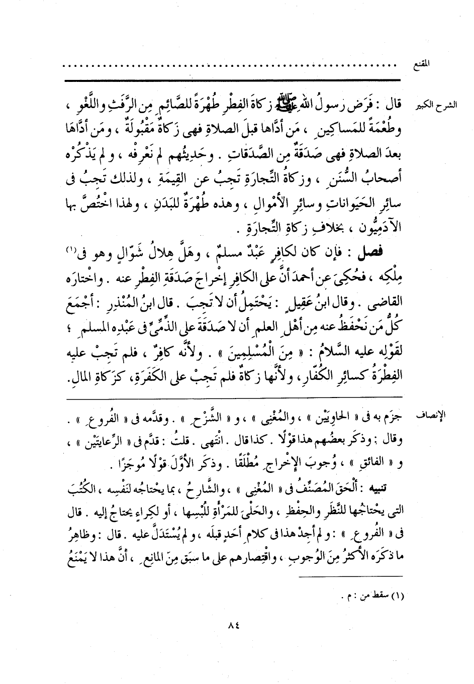 جزَم به فى «الحاوِيَيْن»، و «المُغْنِى»، و «الشَّرْحِ». وقدَّمه فى «الفُروعِ». وقال: وذكَر بعضُهم هذا قوْلًا. كذا قال. انْتَهى. قلتُ: قدَّم فى «الرِّعايتَيْن»، و «الفائقِ»، وُجوبَ الإِخْراجِ مُطْلَقًا. وذكَر الأوَّلَ. قوْلًا مُوجَزًا.