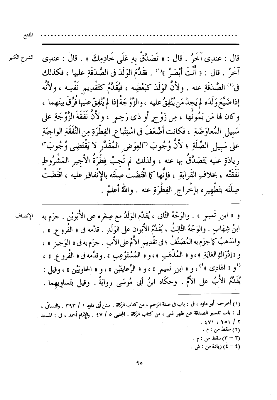 و «ابنِ تَميمٍ». والوَجْهُ الثَّانى، يُقَدَّم الوَلَدُ مع صِغَرِه على الأَبَويْن. جزَم به ابنُ شِهَابٍ. والوَجْهُ الثَّالِثُ، يُقَدَّمُ الأبوان على الوَلَدِ. قدَّمه فى «الفُروعِ». والمذهبُ كما جزَم به المُصَنِّفُ؛ فى تقْدِيمَ الأُمِّ على الأبِ. جزَم به فى «الوَجيزِ»، و «إدرَاكِ الغايَةِ»، و «المُذْهَبِ»، و «المُسْتَوْعِبِ». وقدمه فى «الفُروعِ»، [و «الهادِى»] (¬1)، و «ابنِ تَميمٍ»، و «الرِّعايتَيْن»، و «الحاويَيْن»، وقيل: يُقَدَّمُ الأبُ على الأمِّ. وحكَاه ابنُ أبى مُوسَى رِوايَةً. وقيل بتَساوِيهِما.