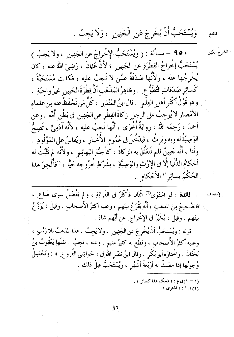قوله: ويُسْتَحَبُّ أنْ يُخْرِجَ عن الجَنِينِ، ولا يَجِبُ. هذا المذهبُ بلا رَيْبٍ، وعليه أكثرُ الأصحابِ، وقطَع به كثيرٌ منهم. وعنه، تجِبُ. نقَلَها يَعْقُوبُ بنُ بَخْتَانَ. واخْتارَه أبو بَكْرٍ. وقال ابنُ نَصْرِ اللَّهِ فى «حَواشِى الفُروعِ»: ويَحْتَمِلُ وُجوبُها إذا مضَتْ له أرْبَعةُ أشْهُر، ويُسْتَحَبُّ قبلَ ذلك.