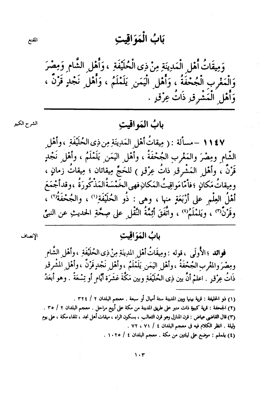 فوائد؛ الأُولَى، قوله: ومِيقَاتُ أهْلِ المدِينَةِ مِنْ ذِى الحُلَيْفَةِ، وأهْلِ الشَّامِ ومِصْرَ والمغْرِبِ الجُحْفَةُ، وأهْلِ اليَمَنِ يَلَمْلَمُ، وأهْلِ نَجْدٍ قَرْنٌ، وأهْلِ المشْرِقِ ذَاتُ عِرْقٍ. اعلمْ أنَّ بين ذِى الحُلَيْفَةِ وبين مَكَّةَ عَشَرَة أيَّامٍ أو تِسْعَةً. وهو أبعَدُ
