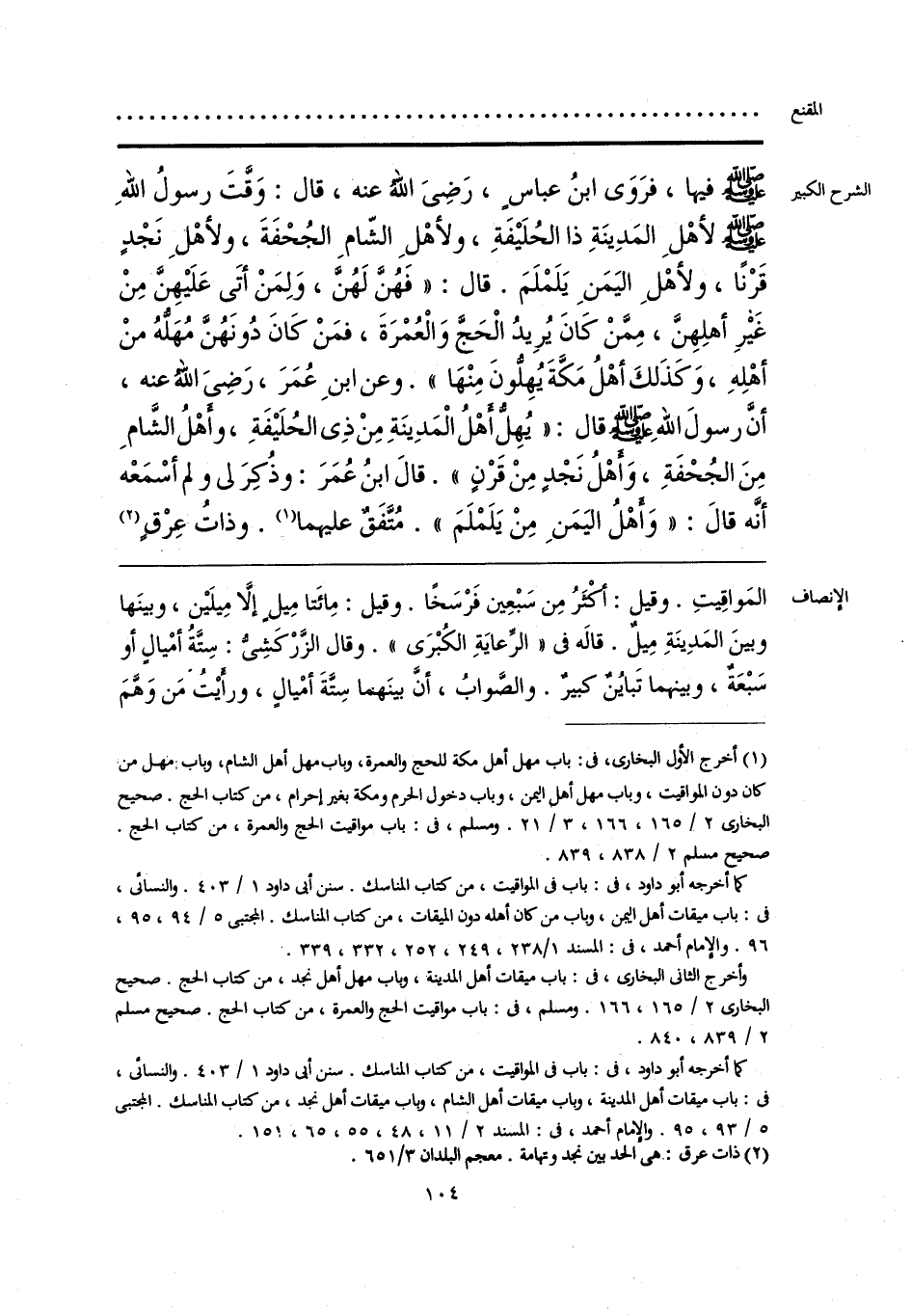 المَواقِيتِ. وقيل: أكْثْرُ مِن سَبْعِين فَرْسَخًا. وقيل: مِائَتا مِيلٍ إلَّا مِيلَيْن، وبينَها وبينَ المَدِينَةِ مِيلٌ. قالَه في «الرِّعايَةِ الكُبْرَى». وقال الزَّرْكَشِيُّ: سِتَّةُ أمْيالٍ أو سَبْعَةٌ، وبينهما تَبايُنٌ كبيرٌ. والصَّوابُ، أنَّ بينَهما سِتَّةَ أمْيالٍ، ورأَيْتُ مَن وَهَّمَ