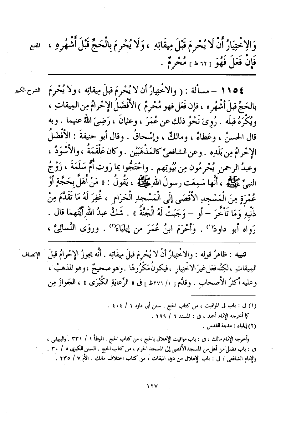 تنبيه: ظاهرُ قولِه: والاخْتِيارُ أنْ لا يُحْرِمَ قبلَ مِيقَاتِه. أنَّه يجوزُ الإحْرامُ قبلَ المِيقاتِ، لكِنَّه فعَل غيرَ الاخْتِيارِ، فيكونُ مَكْرُوهًا. وهو صحيحٌ، وهو المذهبُ، وعليه أكثرُ الأصحابِ. وقدَّم في «الرِّعايَةِ الكُبْرَى»، الجَوازَ مِن