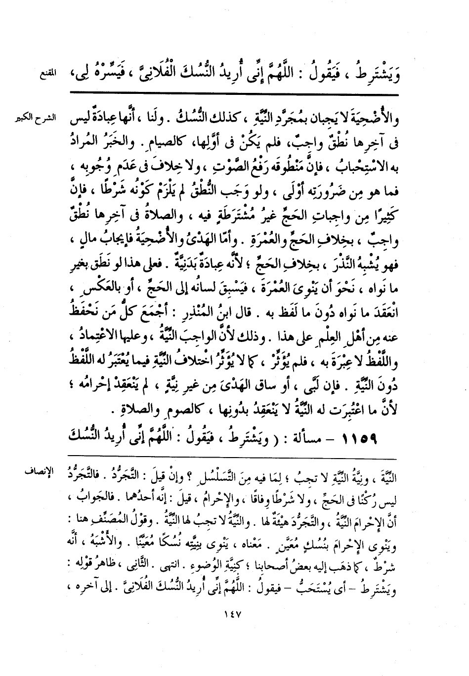 النِّيَّةَ، ونِيَّةُ النِّيَّةِ لا تجِبُ؛ لِمَا فيه مِنَ التَّسَلْسُلِ؟ وإنْ قيلَ: التَّجَرُّدُ. فالتَّجَرُّدُ ليس رُكْنًا في الحَجِّ، ولا شَرْطًا وِفاقًا، والإِحْرامُ، قيلَ: إنَّه أحدُهما. فالجَوابُ، أنَّ الإِحْرامَ النِّيَّةُ، والتَّجَرُّدَ هيْئَةٌ لها. والنِّيَّةُ لا تجِبُ لها النِّيَّةُ. وقوْلُ المُصَنِّفِ هنا: ويَنْوِى الِإحْرامَ بنُسُكٍ مُعَيَّن. مَعْناه، يَنْوِى بنِيَّيِه نُسُكًا مُعَيَّنًا. والأشْبَهُ، أنَّه شرْطٌ، كما ذهَب إليه بعضُ أصحابِنا؛ كنِيَّةِ الوُضوءِ. انتهى. الثَّانِى، ظاهرُ قوْلِه: ويَشْتَرِطُ -أى يُسْتَحَبُّ- فيقولُ: اللَّهُمَّ إنِّى أُرِيدُ النُّسُكَ الفُلَانِىَّ. إلى آخرِه،