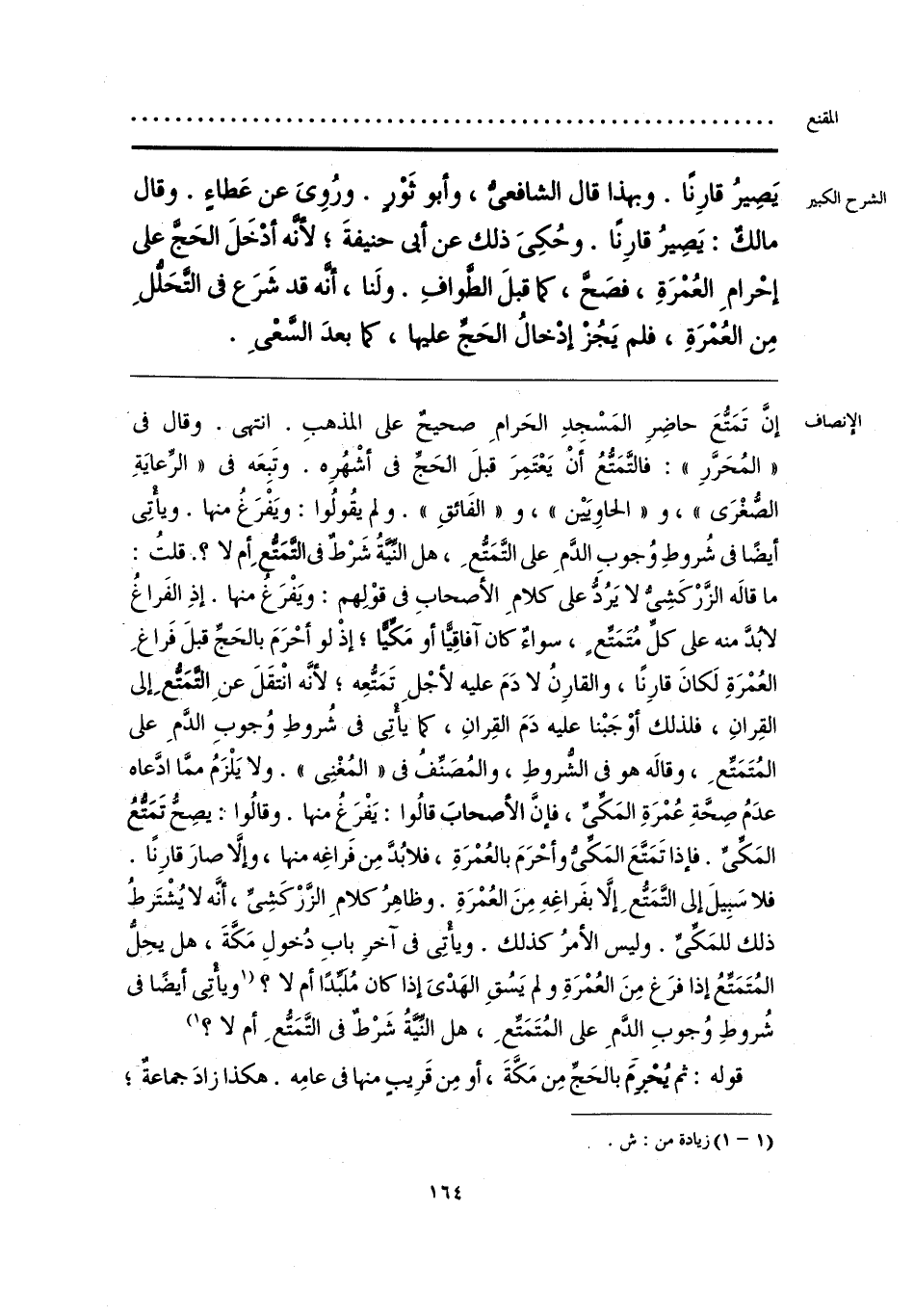 إنَّ تَمَتُّعَ حاضِرِ المَسْجدِ الحَرامِ صحيحٌ على المذهبِ. انتهى. وقال فى «المُحَرَّرِ»: فالتَّمَتُّعُ أَنْ يَعْتَمِرَ قبلَ الحَجِّ فى أشْهُرِه. وتَبِعَه فى «الرِّعايَةِ الصُّغْرَى»، و «الحاوِيَيْن»، و «الفَائقِ». ولم يقُولُوا: ويَفْرَغُ منها. ويأْتِى أيضًا فى شُروطِ وُجوبِ الدَّمِ على التَّمَتُّعِ، هل النيةُ شَرْط فى التَّمَتُّع أم لا؟. قلتُ: ما قالَه الزَّرْكَشِىُّ لا يَرُدُّ على كلامِ الأصحابِ فى قوْلِهم: ويَفْرَغُ منها. إذِ الفَراغُ لابدَّ منه على كلِّ مُتَمَتِّع، سواءٌ كان آفاقِيًّا أو مَكِّيًّا؛ إذْ لو أحْرَمَ بالحَجِّ قبلَ فَراغِ العُمْرَةِ لَكانَ قارِنًا، والقارِنُ لا دَمَ عليه لأجْلِ تَمَتُّعِه؛ لأنَّه انْتقَلَ عنِ التَّمَتُّعِ إلى القِرانِ، فلذلك أوْجَبْنا عليه دَمَ القِرانِ، كما يأْتِى فى شُروطِ وُجوبِ الدَّمِ على المُتَمَتِّعِ، وقالَه هو فى الشروطِ، والمُصَنِّفُ فى «المُغْنِى». ولا يَلْزَمُ ممَّا ادَّعاه عدَمُ صِحَّةِ عُمْرَةِ المَكِّىِّ، فإنَّ إلأصحابَ قالُوا: يَفْرَغُ منها. وقالُوا: يصِحُّ تَمَتعُ المَكِّىِّ. فإذا تَمَتَّعَ المَكِّىُّ وأحْرَمَ بالعُمْرَةِ، فلابُدَّ مِن فَراغِه منها، وإلَّا صارَ قارِنًا. فلا سَبِيلَ إلى التَّمَتُّعِ إلَّا بفَراغِهِ مِنَ العُمْرَةِ. وظاهِرُ كلامِ الزَّرْكَشِىِّ، أنَّه لا يُشْتَرطُ ذلك للمَكِّىِّ. وليس الأمرُ كذلك. ويأْتِى فى آخرِ بابِ دُخولِ مَكَّةَ، هل يحِلُّ المُتَمَتِّعُ إذا فرَغ مِنَ العُمْرَةِ ولم يَسُقِ الهَدْىَ إذا كان مُلبِّدًا أم لا؟ [ويأْتِى أيضًا فى شُروطِ وُجوبِ الدَّمِ على المُتَمَتِّعِ، هل النِّيَّةُ شَرْطٌ فى التَّمَتُّعِ أم لا؟] (¬1)
