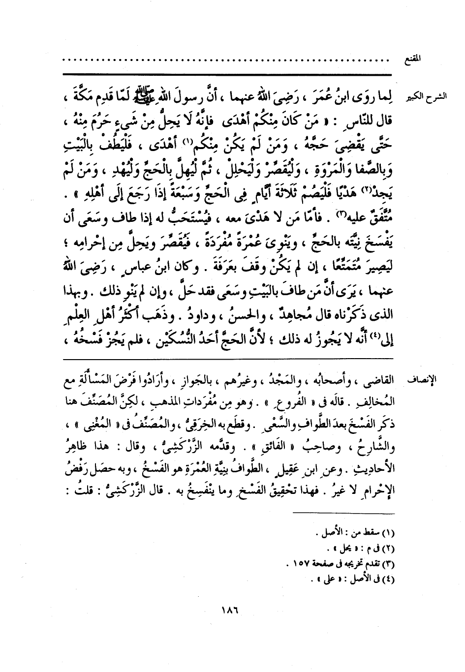 القاضى، وأصحابُه، والمَجْدُ، وغيرُهم، بالجَوازِ، وأرَادُوا فَرْضَ المَسْأَلَةِ مع المُخالِفِ. قالَه فى «الفُروعِ». وهو مِن مُفْرَداتِ المذهبِ، لكِنَّ المُصَنِّفَ هنا ذكَر الفَسْخَ بعدَ الطَّوافِ والسَّعْىِ. وقطَع به الخِرَقِىُّ، والمُصَنِّفُ فى «المُغْنِى»، والشَّارِحُ، وصاحِبُ «الفَائقِ». وقدَّمه الزَّرْكَشِى، وقال: هذا ظاهِرُ الأحادِيثِ. وعنِ ابنِ عَقِيل، الطَّوافُ بنِيَّةِ العُمْرَةِ هو الفَسْخُ، وبه حصَل رَفْضُ الإحْرامِ لا غيرُ. فهذا تحْقِيقُ الفَسْخِ وما ينْفَسِخُ به. قال الزَّرْكَشِى: قلتُ: