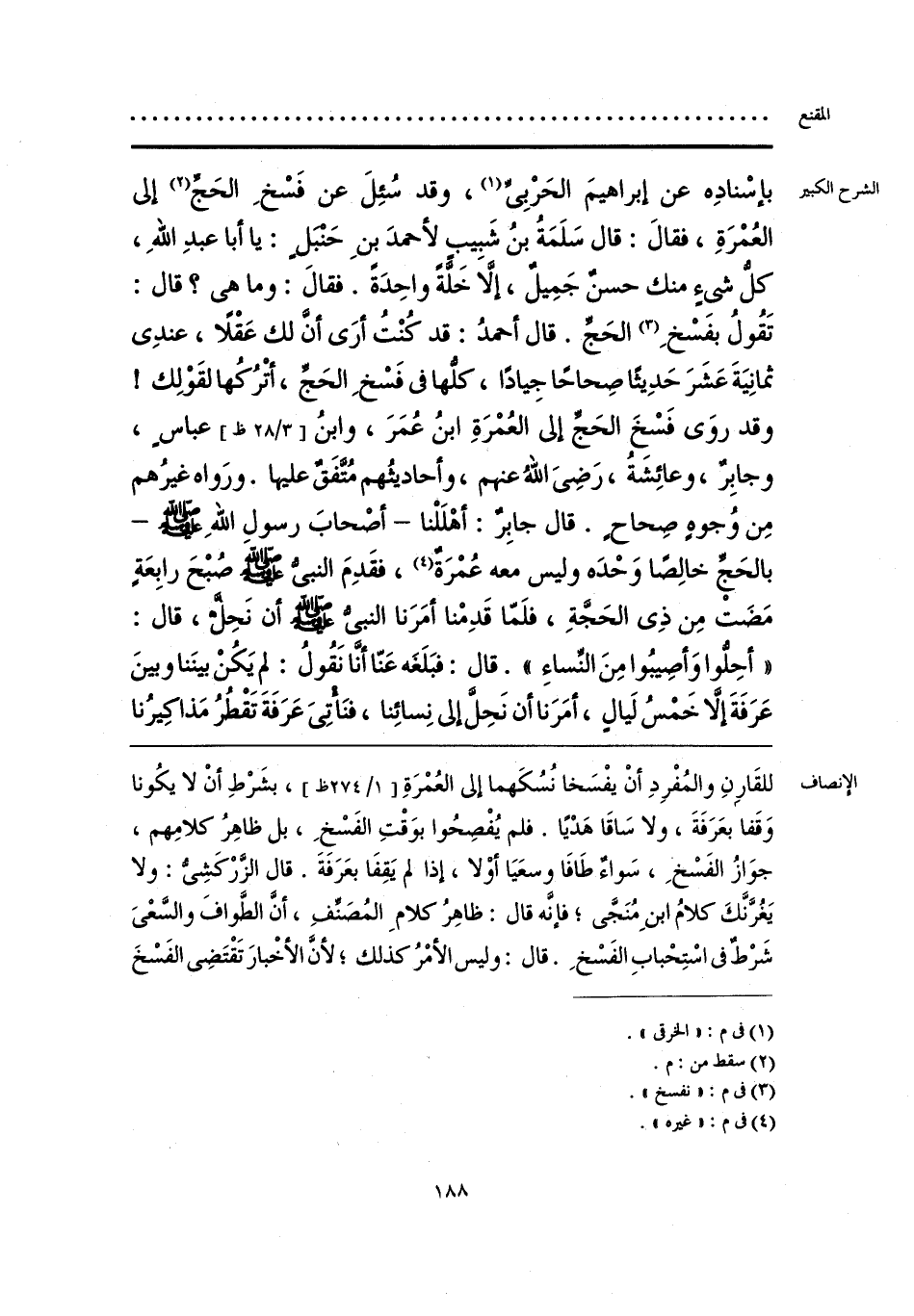 للقَارِنِ والمُفْرِدِ أنْ يفْسَخا نُسُكَهما إلى العُمْرَةِ، بشَرْطِ أنْ لا يكُونا وَقَفا بعَرَفَةَ، ولا سَاقَا هَدْيًا. فلم يُفْصِحُوا بوَقْتِ الفَسْخِ، بل ظاهِرُ كلامِهم، جوَازُ الفَسْخِ، سَواءٌ طَافَا وسعَيَا أوْلا، إذا لم يَقِفَا بعَرَفةَ. قال الزَّرْكَشِى: ولا يَغُرَّنَّكَ كلامُ ابنِ مُنَجَّى؛ فإنَّه قال: ظاهِرُ كلامِ المُصَنِّفِ، أنَّ الطَّوافَ والسَّعْىَ شَرْطٌ فى اسْتِحْبابِ الفَسْخِ. قال: وليس الأمْرُ كذلك؛ لأنَّ الأخْبارَ تَقْتَضِى الفَسْخَ