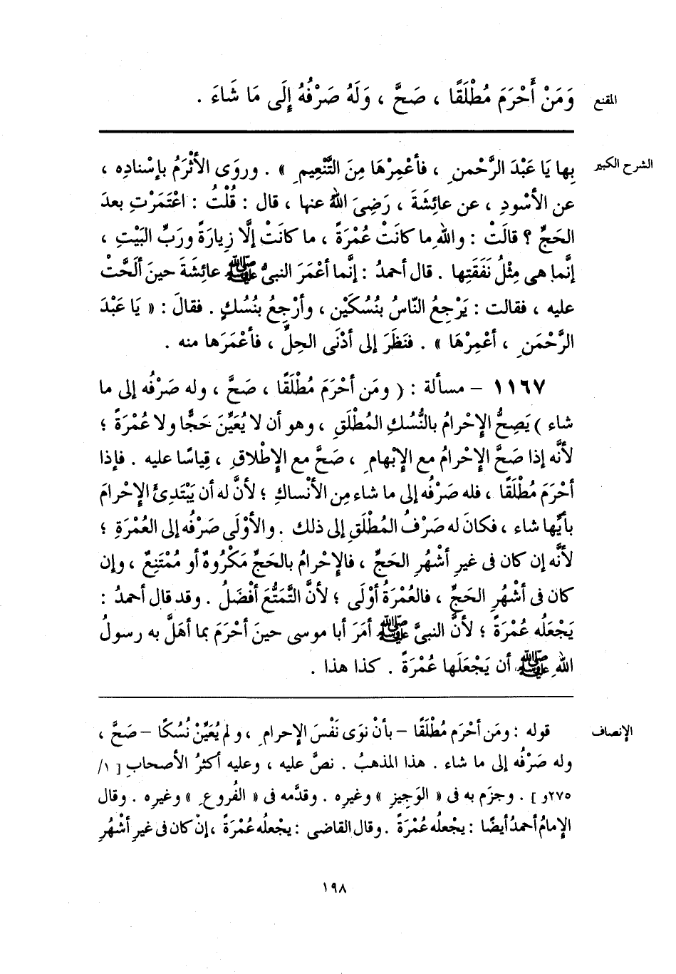 قوله: ومَن أحْرَم مُطْلَقًا - بأنْ نوَى نَفْسَ الإحرامِ، ولم يُعَيِّنْ نُسُكًا - صَحَّ، وله صَرْفُه إلى ما شاء. هذا المذهبُ. نصَّ عليه، وعليه أكثرُ الأصحابِ. وجزَم به فى «الوَجِيزِ» وغيرِه. وقدَّمه فى «الفُروعِ» وغيرِه. وقال الإمامُ أحمدُ أيضًا: يجْعلُه عُمْرَةً. وقال القاضى: يجْعلُه عُمْرَةً، إن كان فى غيرِ أشْهُرِ