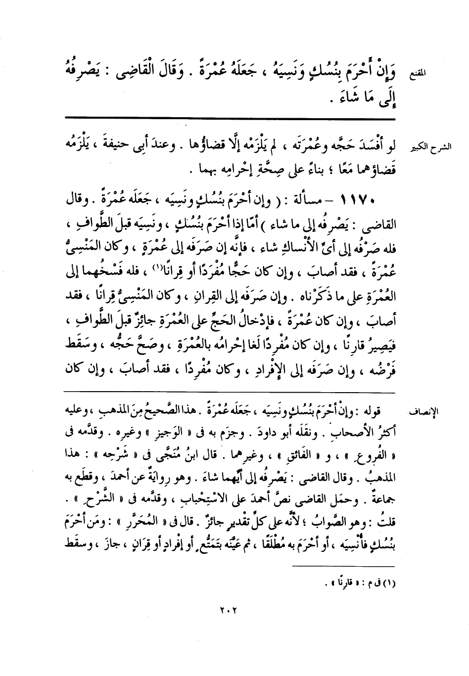 قوله: وإنْ أحْرَمَ بنُسُكٍ ونَسِيَه، جَعَلَه عُمْرَةً. هذا الصَّحيحُ مِنَ المذهبِ، وعليه أكثرُ الأصحابِ. ونقَلَه أبو داودَ. وجزَم به فى «الوَجيزِ» وغيرِه. وقدَّمه فى «الفُروعِ»، و «الفَائقِ»، وغيرِهما. قال ابنُ مُنَجَّى فى «شَرْحِه»: هذا المذهبُ. وقال القاضى: يَصْرِفُه إلى أيِّهما شاءَ. وهو رِوايَةٌ عن أحمدَ، وقطَع به جماعةٌ. وحمَل القاضى نصَّ أحمدَ على الاسْتِحْبابِ، وقدَّمه فى «الشَّرْحِ». قلتُ: وهو الصَّوابُ؛ لأنَّه على كلِّ تقْديرٍ جائزٌ. قال فى «المُحَرَّر»: ومَن أحْرَمَ بنُسُكٍ فأُنْسِيَه، أو أحْرَمَ به مُطْلَقًا، ثم عَيَّنَه بتَمَتُّعٍ أو إفْرادٍ أو قِرَانٍ، جازَ، وسقَط