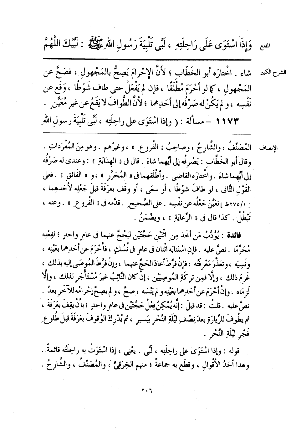 قوله: وإذا اسْتَوَى على راحِلَتِه، لَبَّى. يعْنِى، إذا اسْتَوَتْ به راحِلَتُه قائمةً. وهذا أحَدُ الاْقْوالِ، وقطَع به جماعةٌ؛ منهم الخِرَقِىُّ، والمُصَنِّفُ، والشَّارِحُ.