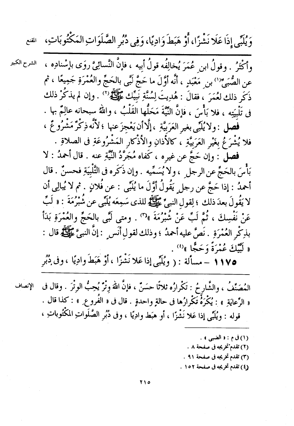 وَيُلَبِّى إِذَا عَلَا نَشزًا، أَوْ هَبَطَ وَادِيًا، وَفِى دُبُرِ الصَّلَوَاتِ المَكْتُوبَاتِ،