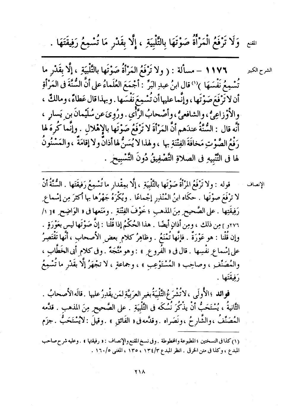 قوله: ولا تَرْفَعُ المرْأةُ صَوْتَها بالتَّلْبِيَةِ، إلَّا بمِقْدارِ ما تُسْمِعُ رَفيقَتَها. السُّنَّةُ أنْ لا ترْفَعَ صوْتَها. حكَاه ابنُ المُنْذِرِ إجْماعًا. ويُكْرَهُ جَهْرُها بها أكثرَ مِن إسْماعِ رَفِيقَتِها. على الصَّحيحِ مِنَ المذهبِ؛ خَوْفَ الفِتْنَةِ. ومَنَعها فى «الوَاضِحِ» مِن ذلك، ومِن أذانٍ أيضًا. هذا الحُكْمُ إذا قُلْنا: إنَّ صَوْتَها ليس بعَوْرَةٍ. وإن قُلْنا: هو عَوْرَةٌ. فإنَّها تُمْنَعُ. وظاهِرُ كلامِ بعضِ الأصحابِ، أنَّها تَقْتَصِرُ على إسْماعِ نفْسِها. قال فى «الفُروعِ»: وهو مُتَّجَهٌ. وفى كلامِ أبى الخَطَّابِ، والمُصَنِّفِ، وصاحِب «المُسْتَوْعِبِ»، وجماعةٍ، لا تجْهَرُ إلَّا بقَدْرِ ما تُسْمِعُ رَفِيقَتَها.