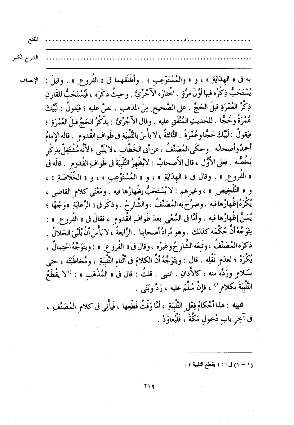 به فى «الهِدَايَةِ»، و «والمُسْتَوْعِبِ». وأطْلَقهما فى «الفُروعِ». وقيلَ: يُسْتَحَبُّ ذِكْرُه فيها أوَّلَ مرَّةٍ. اخْتارَه الآجُرِّيُّ. وحيثُ ذكَرَه، فيسْتَحَبُّ للقَارِنِ ذِكْرُ العُمْرَةِ قبلَ الحَجِّ. على الصَّحيحِ مِنَ المذهبِ. نصَّ عليه؛ فيَقولُ: لَبَّيْكَ عُمْرَةً وحَجًّا. للحَديثِ المُتَّفَقِ عليه. وقال الآجُرِّىُّ: يذْكُرُ الحَجَّ قبلَ العُمْرَةِ؛ فيَقولُ: لَبَّيْكَ حَجًّا وعُمْرَةً. الثَّالثةُ، لا بأْسَ بالتَّلْبيَةِ فى طَوافِ القُدومِ. قالَه الإمامُ أحمدُ وأصحابُه. وحكَى المُصَنِّفُ، عن أبى الخَطَّابِ، لا يُلبِّى؛ لأنَّه مُشْتَغِلٌ بذِكْرٍ يَخُصُّه. فعلى الأوَّلِ، قال الأصحابُ: لا يُظْهِرُ التَّلْبِيَةَ فى طَوافِ القُدومِ. قالَه فى «الفُروعِ». وقال فى «الهِدَايَةِ»، و «المُسْتَوْعِبِ»، و «الخُلَاصَةِ»، و «التَّلْخِيصِ»، وغيرِهم: لا يُسْتَحَبُّ إظْهارُها فيه. ومَعْنَى كلامِ القاضى، يُكْرَهُ إظْهارُها فيه. وصرَّح به المُصَنِّفُ، والشَّارِحُ. وذكَر فى «الرِّعايَةِ» وَجْهًا؛ يُسَن إظْهارُها فيه. وأمَّا فى السَّعْىِ بعدَ طَوافِ القُدومِ، فقالَ فى «الفُروعِ»: يتَوَجَّهُ أنَّ حُكْمَه كذلك. وهو مُرادُ أصحابِنا. الرَّابعةُ، لا بَأْسَ أنْ يُلَبِّىَ الحَلالُ. ذكرَه المُصَنِّفُ، وتَبِعَه الشَّارِحُ وغيرُه، وقال فى «الفُروعِ»: ويتَوَجَّهُ احْتِمالٌ، يُكْرَهُ؛ لعدَمِ نَقْلِه. فال: ويتَوَجَّهُ أنَّ الكلامَ فى أثْناءِ التَّلْبِيَةِ، ومُخاطَبَتَه، حتى بسَلامٍ ورَدِّه منه، كالأَذانِ. انتهى. قلتُ: قال فى «المُذْهَبِ»: [لا يقْطَعُ التَّلْبِيَةَ بكلامٍ] (¬1)، فإنْ سُلِّمَ عليه، رَدَّ وبَنَى.