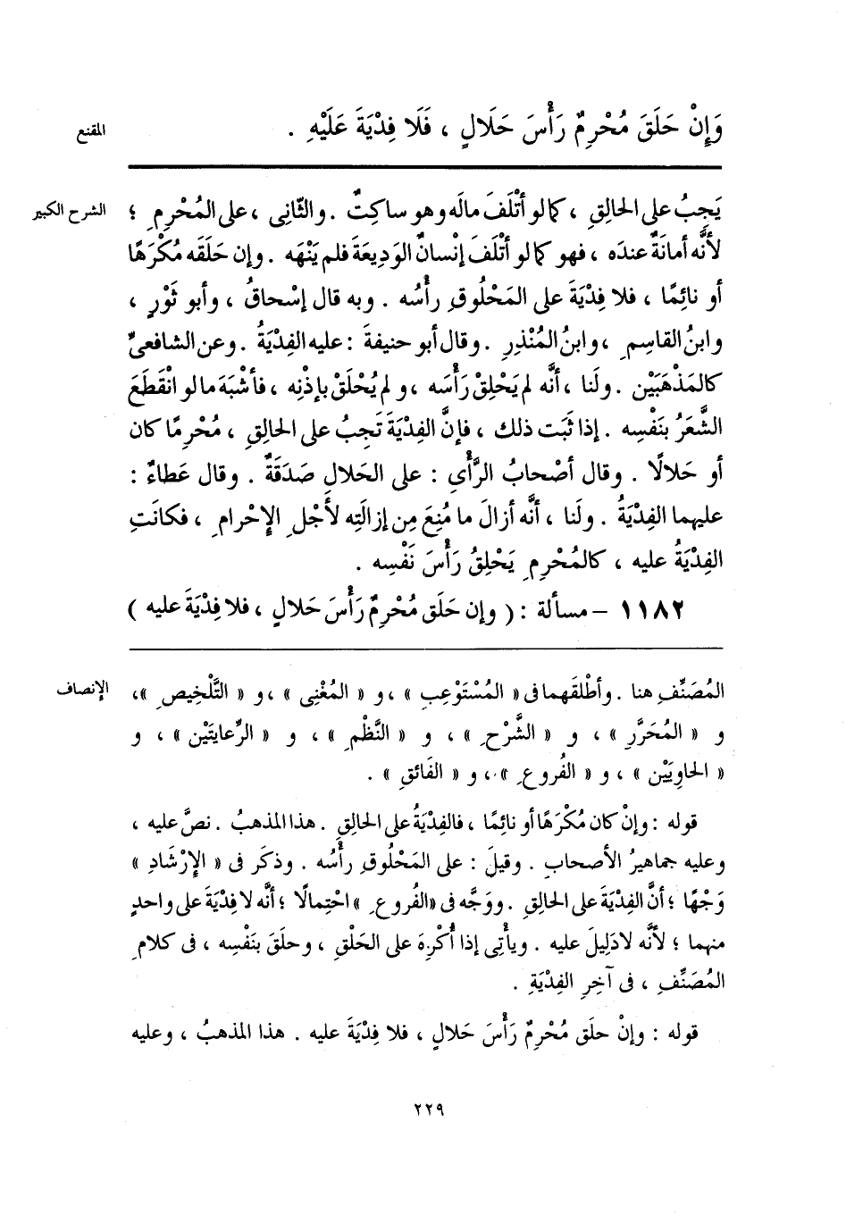 قوله: وإنْ كان مُكْرَهًا أو نائِمًا، فالفِدْيَةُ على الحالِق. هذا المذهبُ. نصَّ عليه، وعليه جماهيرُ الأصحابِ. وقيلَ: على المَحْلُوقِ رأْسُه. وذكَر فى «الإِرْشَادِ» وَجْهًا؛ أنَّ الفِدْيَةَ على الحالِقِ. ووَجَّه فى «الفُروعِ» احْتِمالًا؛ أنَّه لا فِدْيَةَ على واحدٍ فهما؛ لأنَّه لا دَلِيلَ عليه. ويأْتِى إذا أُكْرِهَ على الحَلْقِ، وحلَقَ بنَفْسِه، فى كلامِ المُصَنِّفِ، فى آخِرِ الفِدْيَةِ.