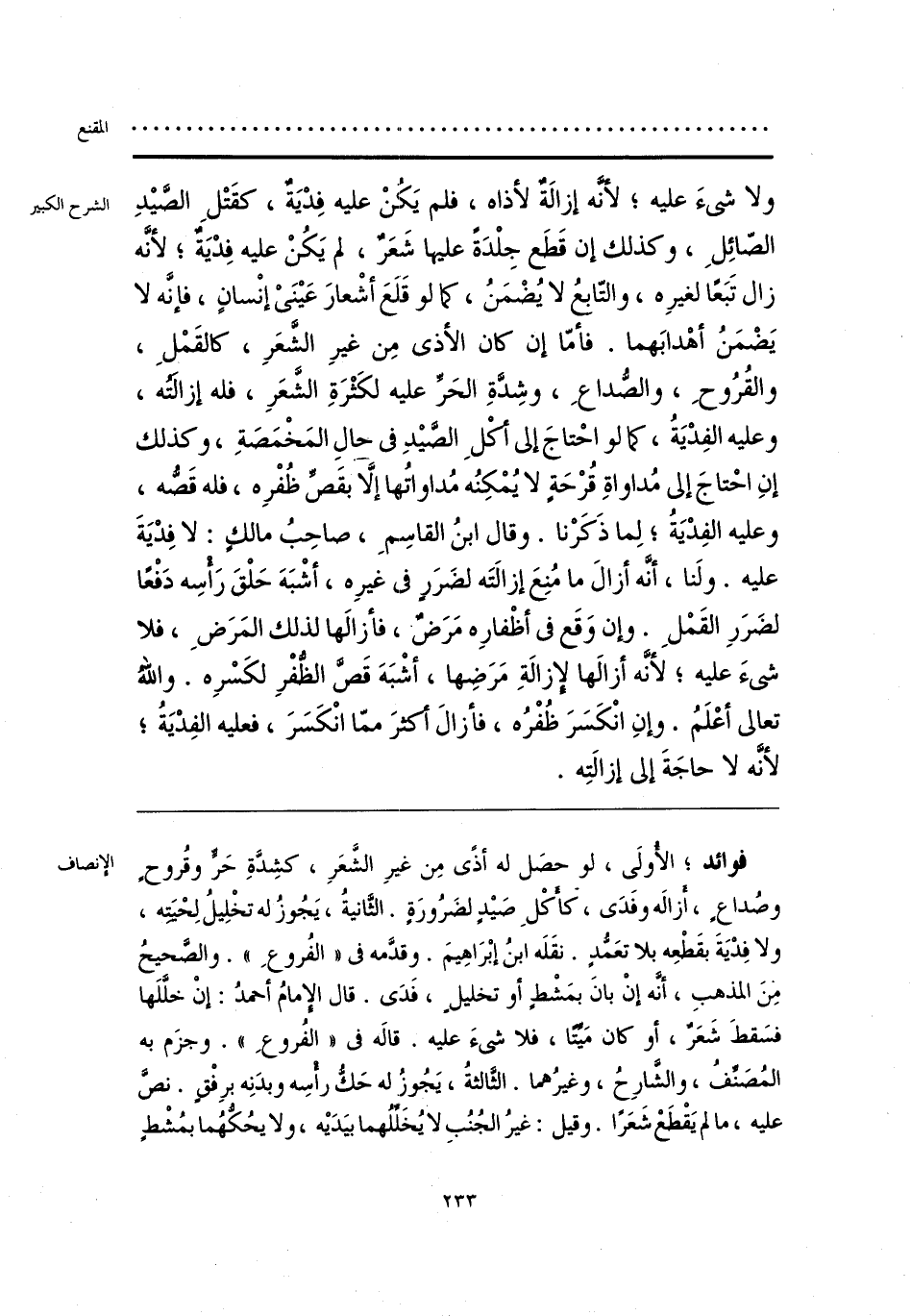 فوائد؛ الأُولَى، لو حصَل له أذَّى مِن غيرِ الشَّعَرِ، كشِدَّةِ حَرٍّ وقُروحٍ وصُداع، أَزالَه وفَدَى، كأَكْلِ صَيْدٍ لضَرُورَةٍ. الثَّانيةُ، يَجُوزُ له تخْلِيلُ لِحْيَتِه، ولا فِدْيَةَ بقَطْعِه بلا تعَمُّدٍ. نقَلَه ابنُ إبْرَاهِيمَ. وقدَّمه فى «الفُروعِ». والصَّحيحُ مِنَ المذهبِ، أنَّه إنْ بانَ بمَشْطٍ أو تخليلٍ، فَدَى. قال الإمامُ أحمدُ: إنْ خلَّلَها فسَقطَ شَعَرٌ، أو كان مَيِّتًا، فلا شئَ عليه. قالَه فى «الفُروعِ». وجزَم به المُصَنِّفُ، والشَّارِحُ، وغيرُهما. الثَّالثةُ، يَجُوزُ له حَكُّ رأْسِه وبدَنِه برِفْقٍ. نصَّ عليه، ما لم يَقْطَعْ شَعَرًا. وقيل: غيرُ الجُنُبِ لا يُخَلُّلُهما بيَدَيْه، ولا يحُكُّهُما بمُشْطٍ