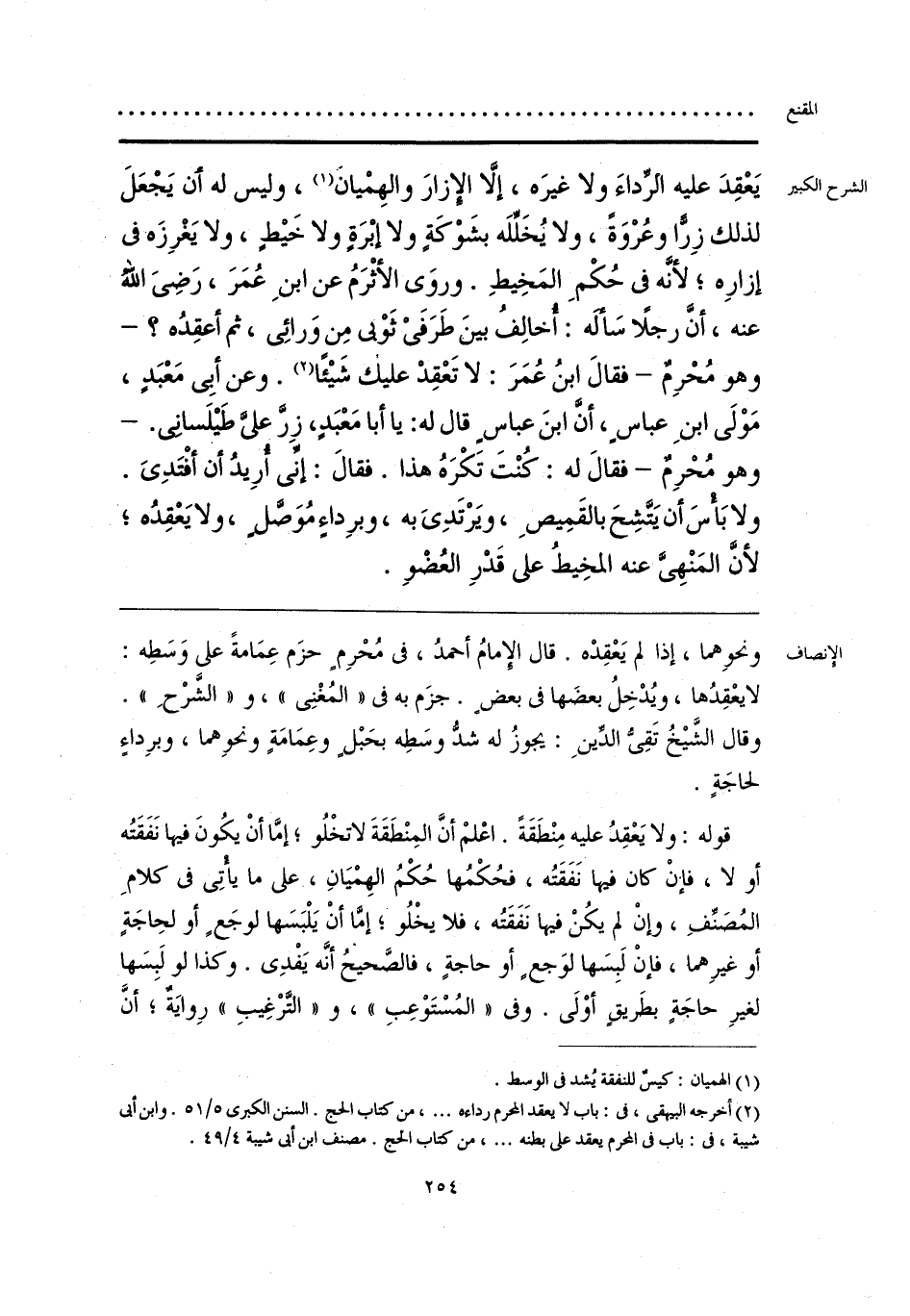 ونحوِهما، إذا لم يَعْقِدْه. قال الِإمامُ أحمدُ، فى مُحْرِمٍ حزَم عِمَامةً على وَسَطِه: لا يعْقِدُها، ويُدْخِلُ بعضَها فى بعضٍ. جزَم به فى «المُغْنِى»، و «الشَّرْحِ». وقال الشَّيْخُ تَقِىُّ الدينِ: يجوزُ له شدُّ وسَطِه بحَبْلٍ وعِمَامَةٍ ونحوِهما، وبرِداءٍ لحاجَةٍ.