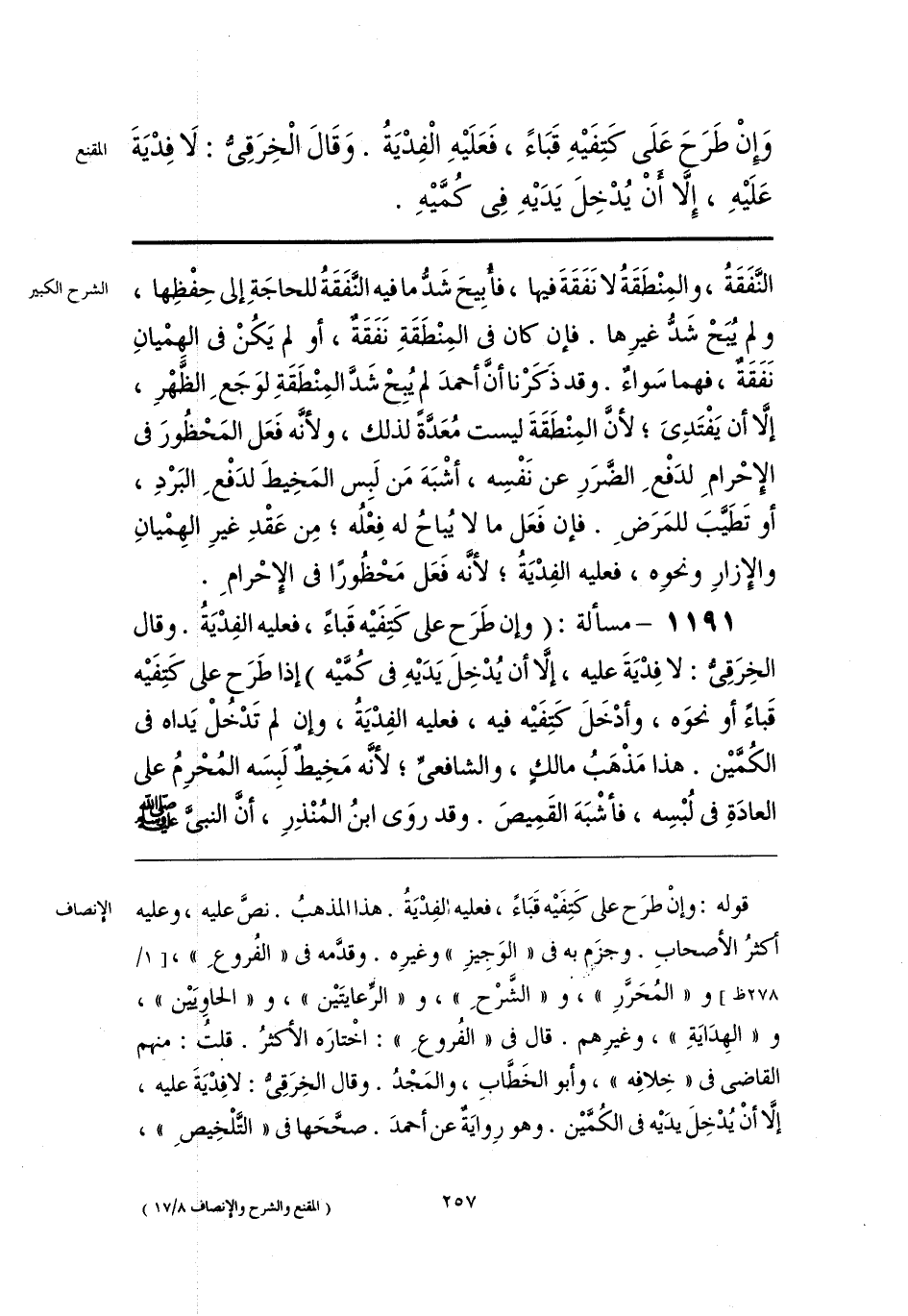 قوله: وإنْ طرَح على كَتِفَيْه قَبَاءً، فعليه ألفِدْيَةُ. هذا المذهبُ. نصَّ عليه، وعليه أكثرُ الأصحابِ. وجزَم به فى «الوَجِيزِ» وغيرِه. وقدَّمه فى «الفُروعِ»، و «المُحَرَّرِ»، و «الشَّرْحِ»، و «الرِّعايتَيْن»، و «الحاوِيَيْن»، و «الهِدَايَةِ»، وغيرِهم. قال فى «الفُروعِ»: اخْتارَه الأكثرُ. قلتُ: منهم القاضى فى «خِلافِه»، وأبو الخَطَّابِ، والمَجْدُ. وقال الخِرَقِىُّ: لا فِدْيَةَ عليه، إلَّا أنْ يُدْخِلَ يدَيْه فى الكُمَّيْن. وهو رِوايَةٌ عن أحمدَ. صحَّحَها فى «التَّلْخِيصِ»،