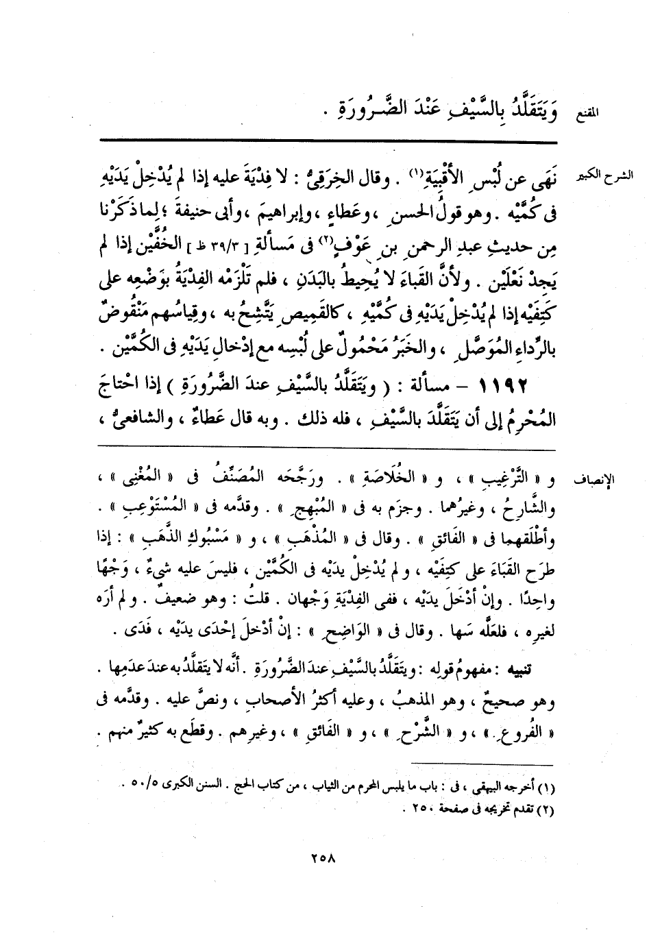 و «الترْغِيبِ»، و «الخُلَاصَةِ». ورَجَّحَه المُصَنِّفُ فى «المُغْنِى»، والشَّارِحُ، وغيرُهما. وجزَم به فى «المُبْهِجِ». وقدَّمه فى «المُسْتَوْعِبِ». وأطْلَقهما فى «الفَائقِ». وقال فى «المُذْهَبِ»، و «مَسْبُوكِ الذَّهَبِ»: إذا طرَح القَبَاءَ على كتِفَيْه، ولم يُدْخِلْ يدَيْه فى الكُمَّيْن، فليسَ عليه شئٌ، وَجْهًا واحِدًا. وإنْ أدْخَلَ يدَيْه، ففى الفِدْيَةِ وَجْهان. قلتُ: وهو ضعيفٌ. ولم أرَه لغيرِه، فلعَلَّه سَها. وقال فى «الوَاضِحِ»: إنْ أدْخلَ إحْدَى يدَيْه، فَدَى.