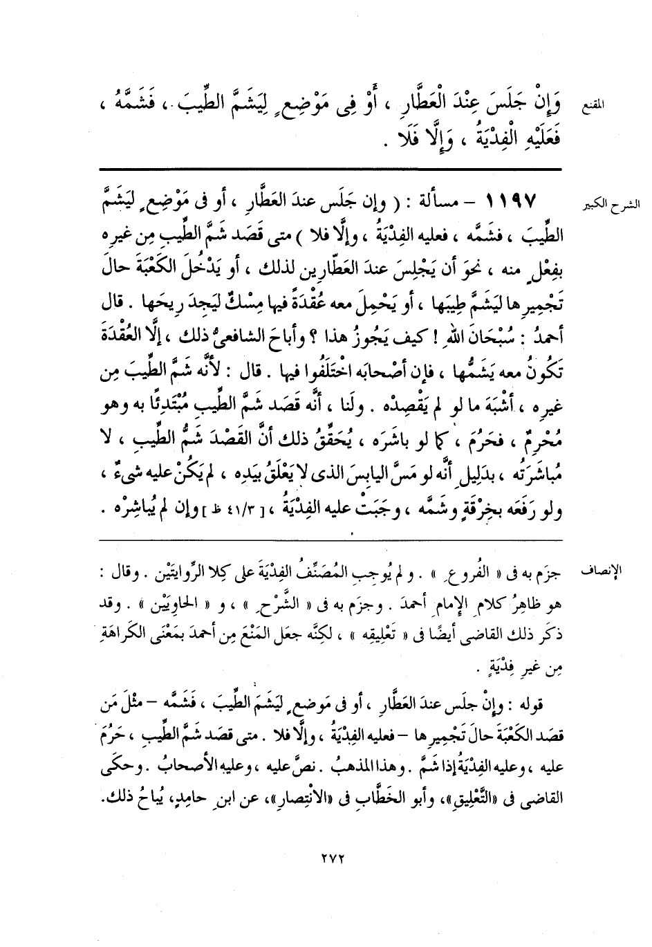 قوله: وإنْ جلَس عندَ العَطَّارِ، أو فى مَوضعٍ ليَشَمَّ الطِّيبَ، فَشَمَّه -مثْلَ مَن قصَد الكَعْبَةَ حالَ تَجْمِيرِها- فعليه الفِديَةُ، وإلَّا فلا. متى قصَد شَمَّ الطِّيبِ، حَرُمَ عليه، وعليه الفِدْيَةُ إذا شَمَّ. وهذا المذهبُ. نصَّ عليه، وعليه الأصحابُ. وحكَى القاضى فى «التَّعْلِيقِ»، وأبو الخَطَّابِ فى «الانْتِصارِ»، عن ابنِ حامِدٍ، يُباحُ ذلك.