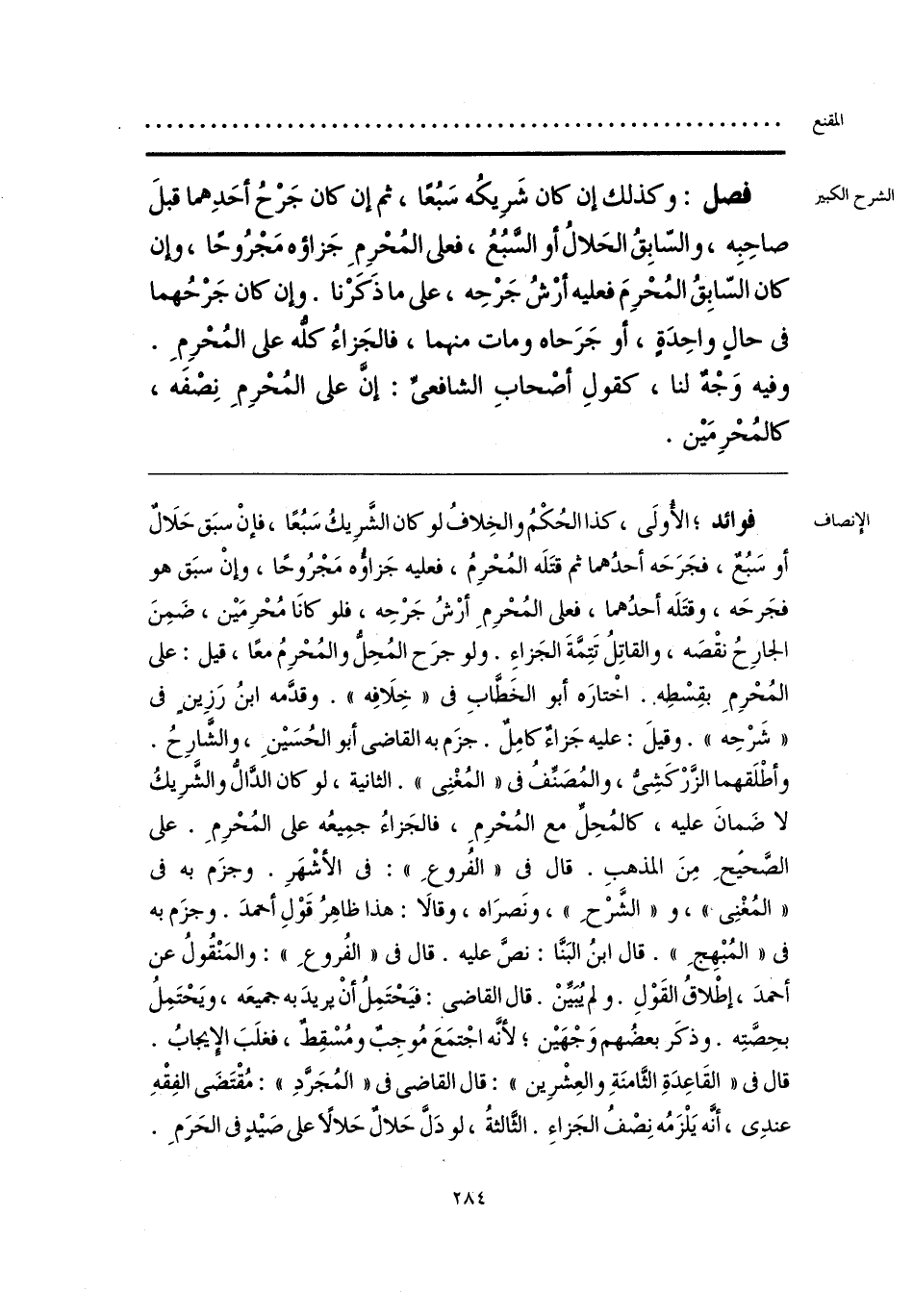فوائد؛ الأُولَى، كذا الحُكْمُ والخِلافُ لو كان الشَّرِيكُ سَبُعًا، فإنْ سبَق حَلَالٌ أو سَبُعٌ، فجَرَحَه أحدُهما ثم قتَلَه المُحْرِمُ، فعليه جَزاؤُه مَجْرُوحًا، وإنْ سبَق هو فجَرحَه، وقتَلَه أحدُهما، فعلى المُحْرِمِ أرْشُ جَرْحِه، فلو كانَا مُحْرِمَيْن، ضَمِنَ الجارِحُ نقْصَه، والقاتِلُ تَتِمَّةَ الجَزاءِ. ولو جرَح المُحِلُّ والمُحْرِمُ معًا، قيل: على المُحْرِمِ بقِسْطِه. اخْتارَه أبو الخَطَّابِ فى «خِلَافِه». وقدَّمه ابنُ رَزِينٍ فى «شَرْحِه». وقيلَ: عليه جَزاءٌ كامِلٌ. جزَم به القاضى أبو الحُسَيْنِ، والشَّارِحُ. وأطْلَقهما الزَّرْكَشِىُّ، والمُصَنِّفُ فى «المُغْنِى». الثانية، لو كان الدَّالُّ والشَّرِيكُ لا ضَمانَ عليه، كالمُحِلِّ مع المُحْرِمِ، فالجَزاءُ جمِيعُه على المُحْرِمِ. على الصَّحيَحِ مِنَ المذهبِ. قال فى «الفُروعِ»: فى الأشْهَرِ. وجزَم به فى «المُغْنِى»، و «الشَّرْحِ»، ونَصرَاه، وقالَا: هذا ظاهِرُ قَوْلِ أحمدَ. وجزَم به فى «المُبْهِجِ». قال ابنُ البَنَّا: نصَّ عليه. قال فى «الفُروعِ»: والمَنْقُولُ عن أحمدَ، إطْلاقُ القَوْلِ. ولم يُبَيِّنْ. قال القاضى: فيَحْتَمِلُ أنْ يريدَ به جميعَه، ويَحْتَمِلُ بحِصَّتِه. وذكَر بعضُهم وَجْهَيْن؛ لأنَّه اجْتمَعَ مُوجِبٌ ومُسْقِطٌ، فغلَبَ الإِيجابُ. قال فى «القَاعِدَةِ الثَّامنَةِ والعِشْرِين»: قال القاضى فى «المُجَرَّدِ»: مُقْتَضَى الفِقْهِ عندِى، أنَّه يَلْزَمُه نِصْفُ الجَزاءِ. الثَّالثةُ، لو دَلَّ حَلالٌ حَلالًا على صَيْدٍ فى الحَرَمِ.