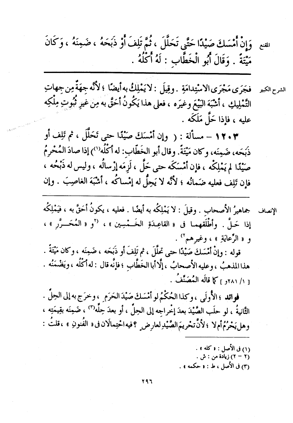 قوله: وإنْ أمْسَكَ صَيْدًا حتى تحلَّلَ، ثم تَلِفَ أو ذَبَحَه، ضَمِنَه، وكان مَيْتَةً. هذا المذهبُ، وعليه الأصحابُ، إلَّا أبا الخَطَّابِ؛ فإنَّه قال: له أكْلُه، ويَضْمَنُه. كما قالَه المُصَنِّفُ.
