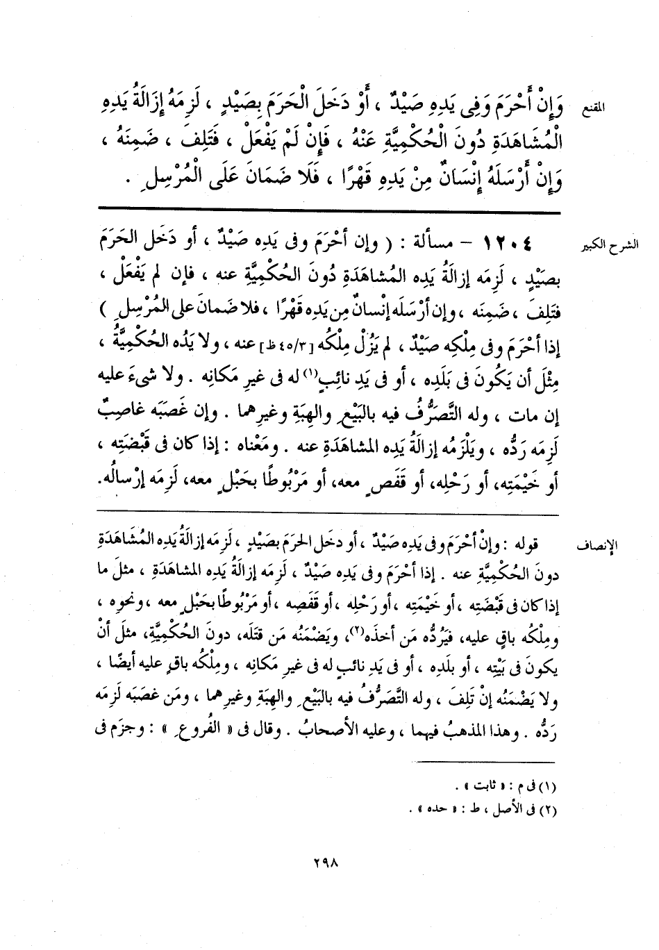 قوله: وإنْ أحْرَمَ وفى يَدِه صَيْدٌ، أو دخَل الحرَمَ بصَيْدٍ، لَزِمَه إزالَةُ يَدِه المُشَاهَدَةِ دونَ الحُكْمِيَّةِ عنه. إذا أحْرَمَ وفى يَدِه صَيْدٌ، لَزِمَه إزالَةُ يَدِه المشاهَدَةِ، مثلَ ما إذا كان فى قَبْضَتِه، أو خَيْمَتِه، أو رَحْلِه، أو قَفَصِه، أو مَرْبُوطًا بحَبْلٍ معه، ونحوِه، ومِلْكُه باقٍ عليه، فيَرُدُّه مَن أخذَه (¬1)، ويَضْمَنُه مَن قتَلَه، دونَ الحُكْمِيَّةِ، مثلَ أنْ يكونَ فى بَيْتِه، أو بلَدِه، أو فى يَدِ نائبٍ له فى غيرِ مَكانِه، ومِلْكُه باقٍ عليه أيضًا، ولا يَضْمَنُه إنْ تَلِفَ، وله التَّصَرُّفُ فيه بالبَيْعِ والهِبَةِ وغيرِهما، ومَن غصَبَه لَزِمَه رَدُّه. وهذا المذهبُ فيهما، وعليه الأصحابُ. وقال فى «الفُروعِ»: وجزَم فى