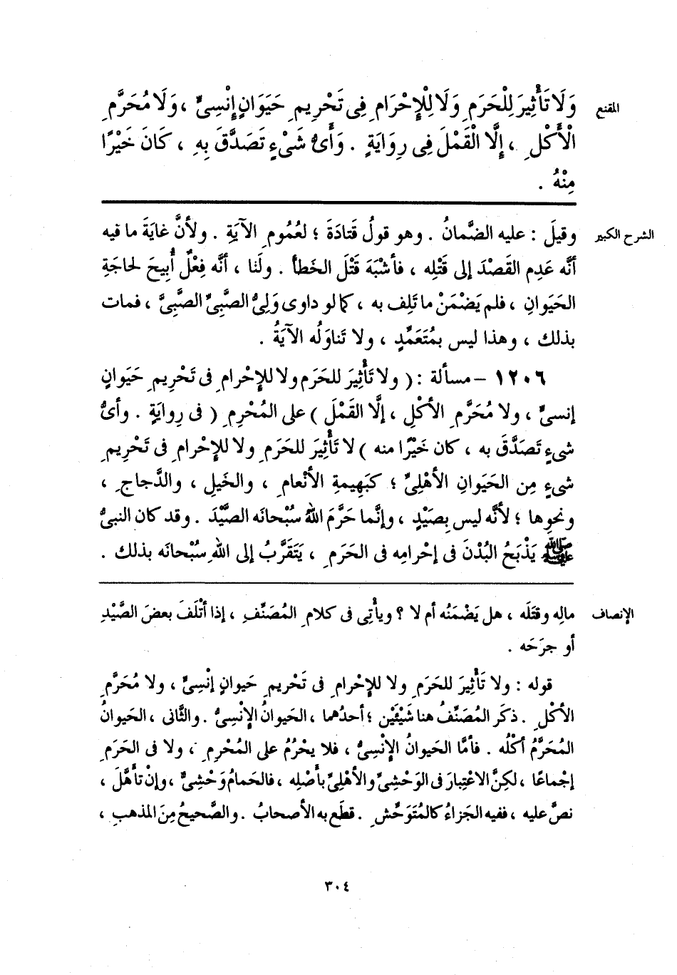 وَلا تَأثِيرَ لِلْحَرَمِ وَلا لِلْإحْرَامِ في تَحْرِيمِ حَيَوَانٍ إنْسِيٍّ، وَلا مُحَرَّمِ الْأَكْلِ.، إلَّا الْقَمْلَ في رِوَايَةٍ. وَأيُّ شَيءٍ تَصَدَّقَ بِهِ، كَانَ خَيْرًا مِنه.