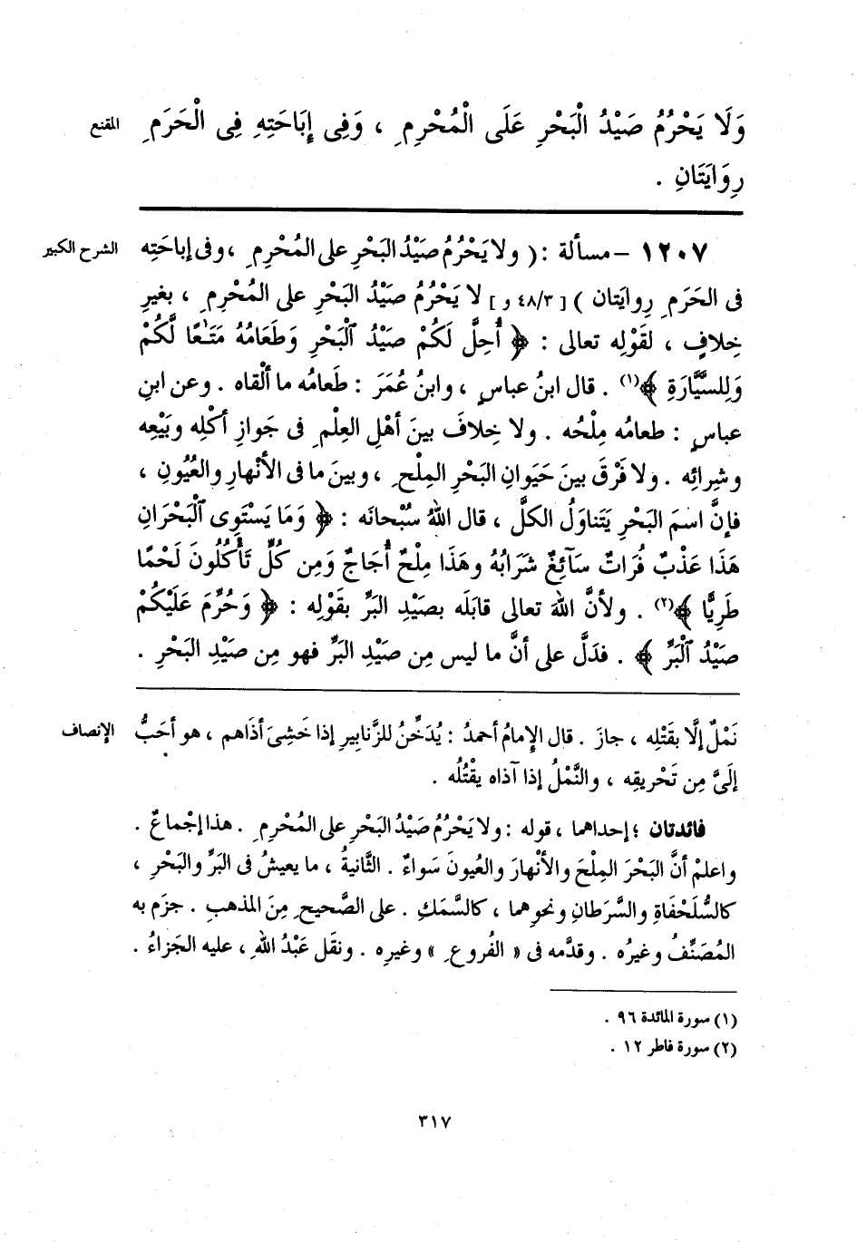 فائدتان؛ إحداهما، قوله: ولا يَحْرُمُ صَيْد البَحْرِ على المُحْرِمِ. هذا إجْماعٌ. واعلمْ أنَّ البَحْرَ المِلْحَ والأنْهارَ والعُيونَ سَواءٌ. الثَّانيةُ، ما يعيشُ في البَرِّ والبَحْرِ، كالسُّلَحْفَاةِ والسَّرَطانِ ونحوِهما، كالسّمَك. على الصَّحيحِ مِنَ المذهبِ. جزَم به المُصَنِّفُ وغيرُه. وقدَّمه في «الفُروعِ» وغيرِه. ونقَل عَبْدُ اللهِ، عليه الجَزاءُ.