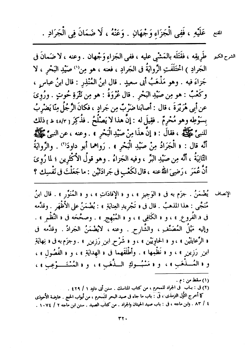 يُضْمَنُ. جزَم به في «الوَجِيزِ»، و «الإفادَاتِ»، و «المُنَورِ». قال ابنُ مُنَجى: هذا المذهبُ. قال فى «تَجْرِيدِ العِنايَةِ»: يُضْمَنُ على الأظْهَرِ. وقدَّمه في «الفُروعِ»، و «الكَافِي»، و «المُبْهِجِ». وصحَّحَه في «النَّظْمِ». وإليه مَيلُ المُصَنِّفِ، والشارِحِ. وعنه، لا يُضْمَن الجَرادُ. وقدَّمه في «الرِّعايتَيْن»، و «الحاوِيَيْن»، و «شَرْحِ ابنِ رَزِينٍ». وجزَم به في «نِهايَةِ ابنِ رَزِين»، و «نَظْمِها». وأطْلَقَهما في «الهِدايَةِ»، و «الفُصُولِ»، و «المُذْهَبِ»، و «مَسْبُوكِ الذَّهَبِ»، و «المُسْتَوْعِبِ»،