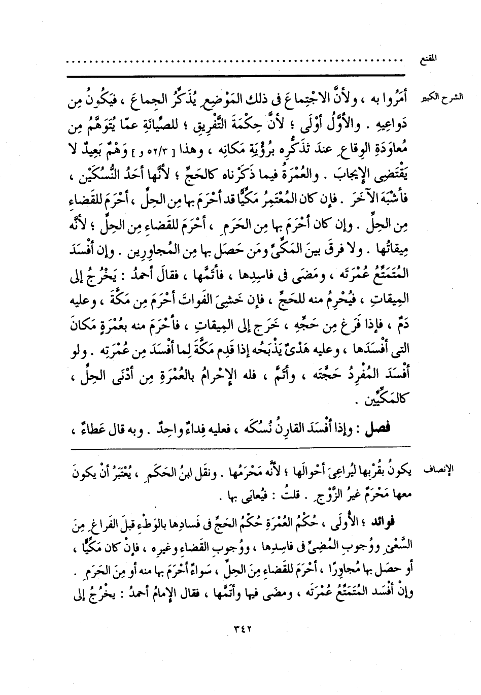 فوائد؛ الأولَى، حُكْمُ العُمْرَةِ حُكْم الحَجِّ في فَسادِها بالوَطْءِ قبلَ الفَراغِ مِنَ السَّعْىِ ووُجوبِ المُضِيِّ في فاسدِها، ووُجوبِ القَضاءِ وغيرِه، فإنْ كان مَكِّيًّا، أو حصَل بها مُجاوِرًا، أحْرَمَ للقَضاءِ مِنَ الحِلِّ، سَواء أحْرَمَ بها منه أو مِنَ الحَرَمِ. وإن أفْسَد المُتَمَتِّعُ عُمْرَتَه، ومضَى فيها وأتَمَّها، فقال الإمامُ أحمدُ: يخْرُجُ إلى