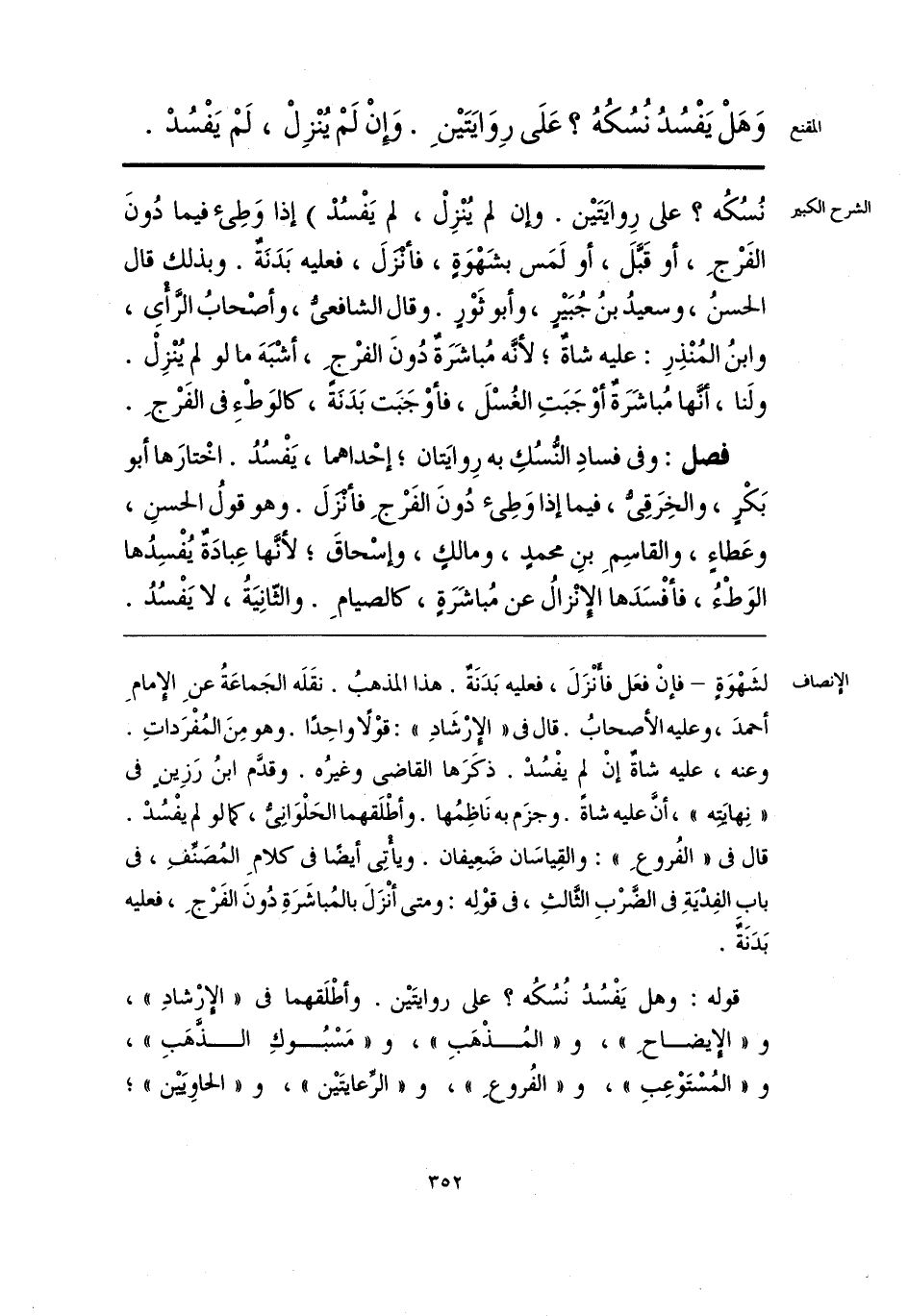 لشَهْوَةٍ - فإنْ فعَل فأنزَلَ، فعليه بَدَنَةٌ. هذا المذهبُ. نقَلَه الجَماعَةُ عنِ الإِمامِ أحمدَ، وعليه الأصحابُ. قال في «الإرْشَادِ»: قوْلاً واحِدًا. وهو مِنَ المُفْرَداتِ. وعنه، عليه شاةٌ إنْ لم يفْسُدْ. ذكَرَها القاضي وغيرُه. وقدَّم ابنُ رَزِينٍ في «نِهايته»، أنَّ عليه شاةً. وجزَم به نَاظِمُها. وأطْلَقهما الحَلْوَانِيُّ، كما لو لم يفْسُدْ. قال في «الفُروعِ»: والقِياسَان ضَعِيفان. ويأْتِي أَيضًا في كلامِ المُصَنِّفِ، في باب الفِدْيَةِ في الضَّرْبِ الثَّالثِ، في قوْلِه: ومتى أنْزَلَ بالمُباشَرَةِ دُونَ الفَرْجِ، فعليه بَدَنةٌ.