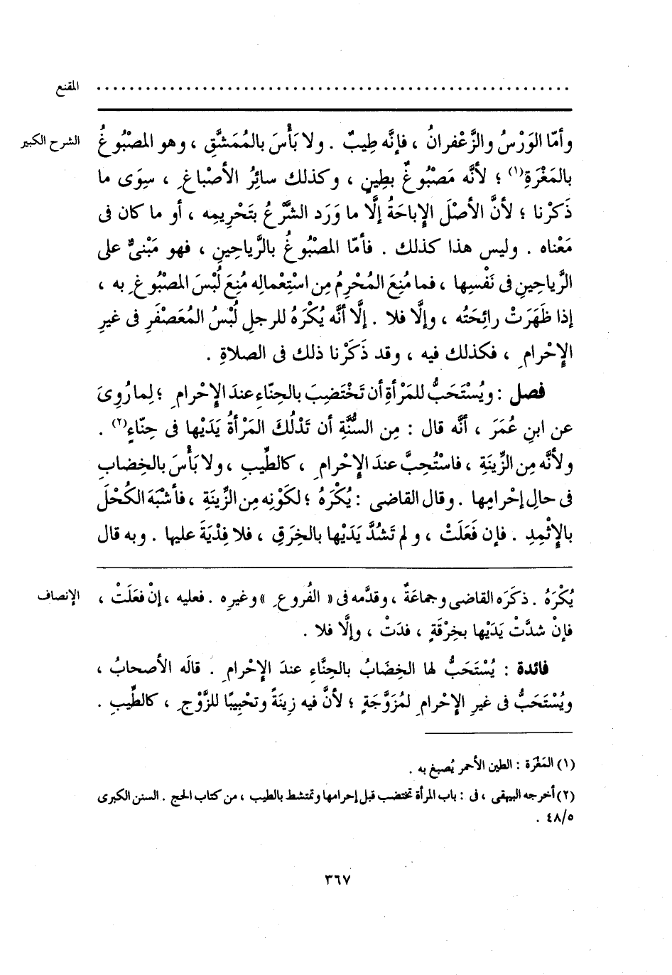 فائدة: يُسْتَحَبُّ لها الخِضَابُ بالحِنَّاءِ عندَ الإحْرامِ. قالَه الأصحابُ، ويُسْتَحَبُّ فى غيرِ الإحْرامِ لمُزَوَّجَةٍ؛ لأنَّ فيه زِينَةً وتحْبِيبًا للزَّوْجِ، كالطِّيبِ.