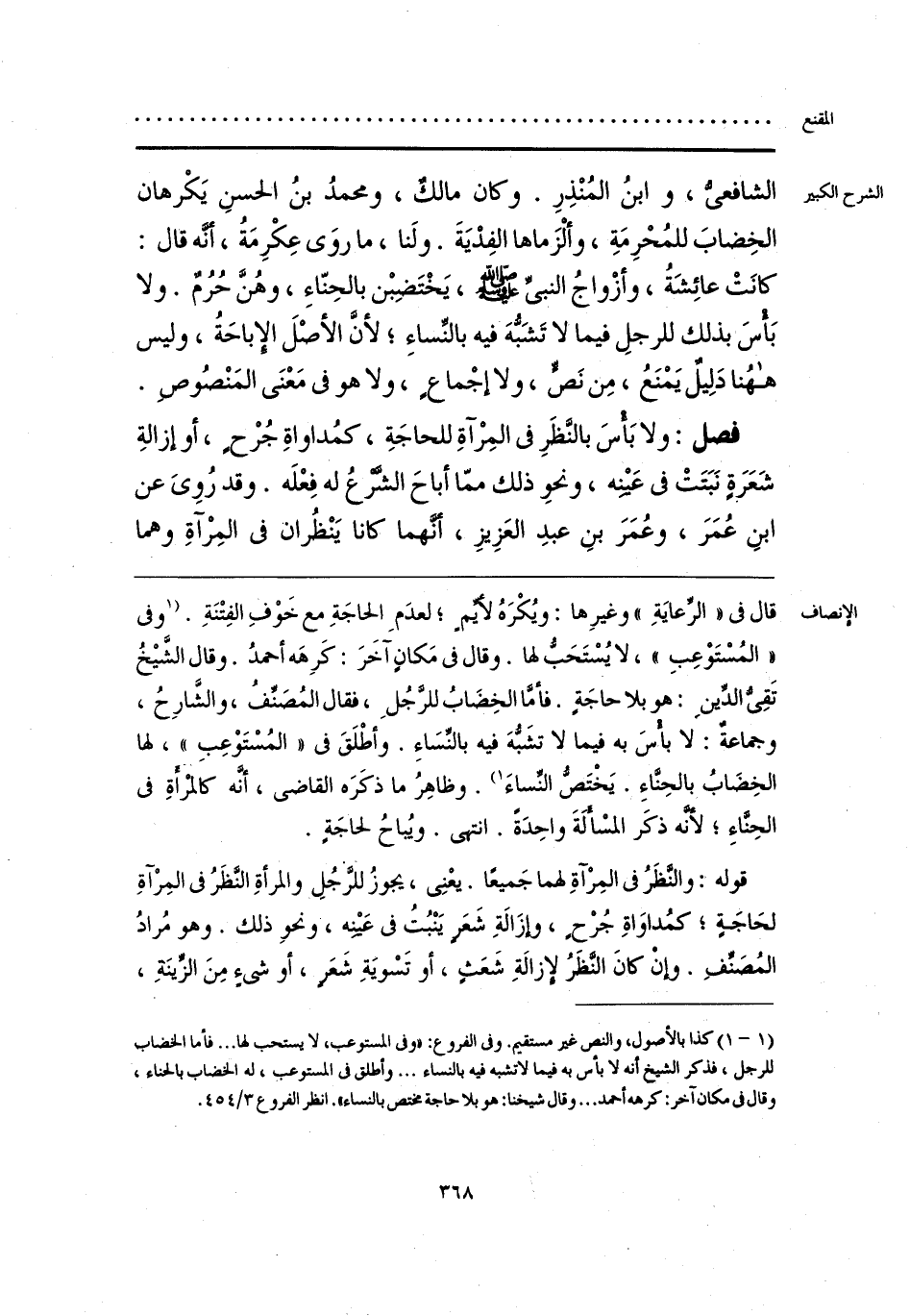 قوله: والنَّظَرُ فى المِرْآةِ لهما جَميعًا. يعْنِى، يجوزُ للرجُلِ والمرأةِ النَّظرُ فى المِرْآةِ لحَاجَةٍ؛ كمُداوَاةِ جُرْحٍ، وإزَالَةِ شَعَرٍ يَنْبُتُ فى عَيْنِه، ونحوِ ذلك. وهو مُرادُ المُصَنِّفِ. وإنْ كانَ النَّظَرُ لإزالَةِ شَعَثٍ، أو تَسْويَةِ شَعَرٍ، أو شئٍ مِنَ الزِّينَةِ،